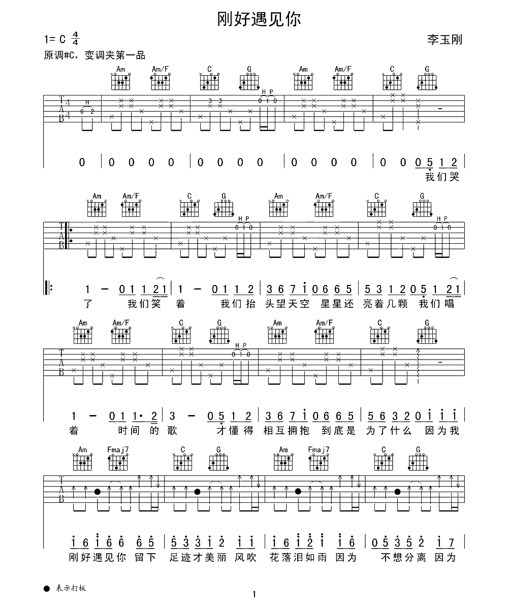 曲谱介绍: 刚好遇见你吉他谱,李玉刚演唱的经典歌曲,简单的歌词独白,舒缓而轻柔,李玉刚没有用“女声”诠释,而是在高低音中轮换演唱。流畅地倾诉了歌曲之中内心的深刻感受,世界上一切的故事似乎都来自于遇见,时间不早也不晚,刚好遇见你就是很好的时机。 《刚好遇见你》吉他弹唱谱,选用C调指法,原调#C,CAPO夹1品弹唱原调,版本完整,原版比例:85%,难度:3级。 弹唱提示:图谱中的“●”代表着打板的节奏,如果对打板不太熟悉的琴友可以适当简化后弹唱。