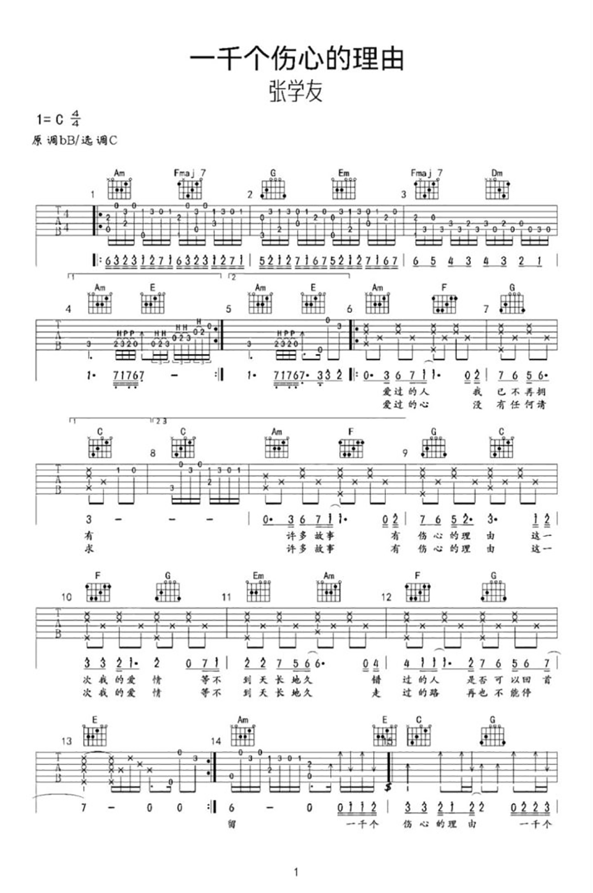 一千个伤心的理由吉他谱 - 张学友 - C调吉他弹唱谱 - 原版