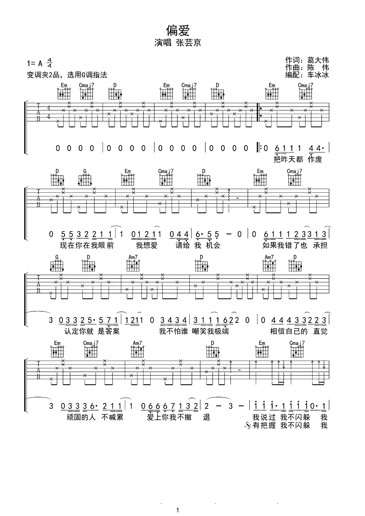 偏爱吉他谱 - 张芸京 - G调吉他弹唱谱 - 原版