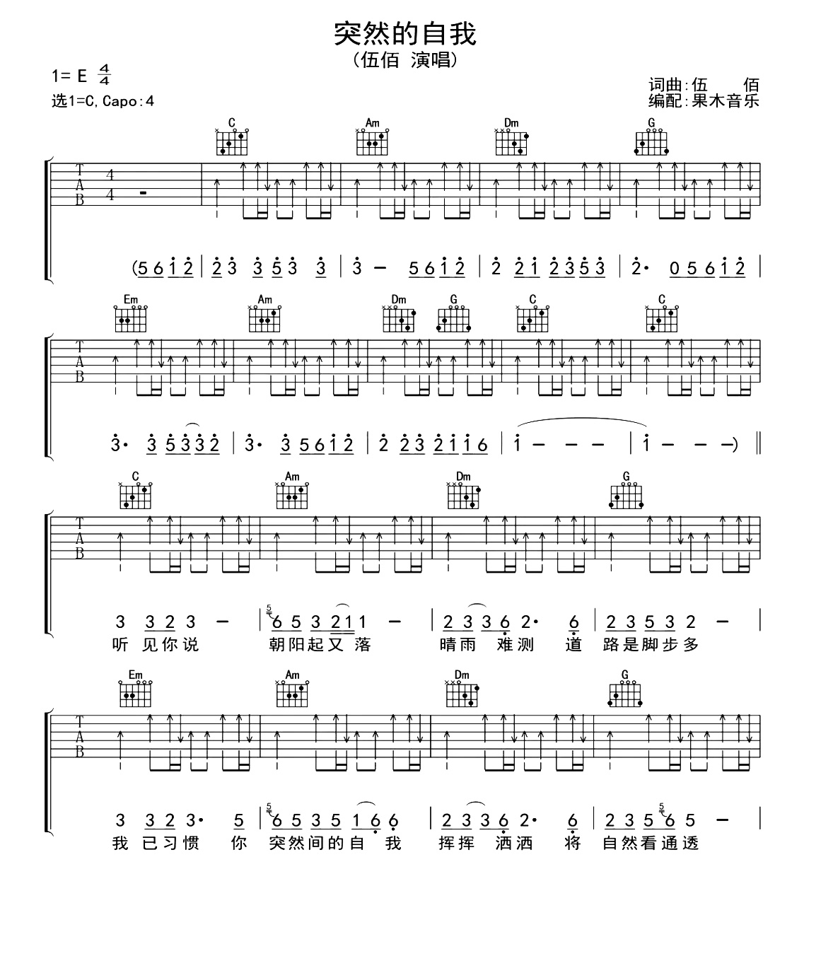 突然的自我吉他谱 - 伍佰 - C调吉他弹唱谱 - 原版