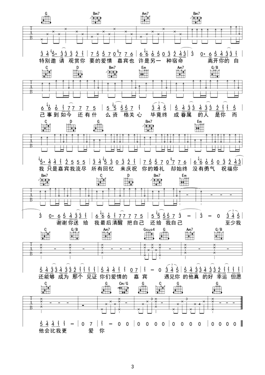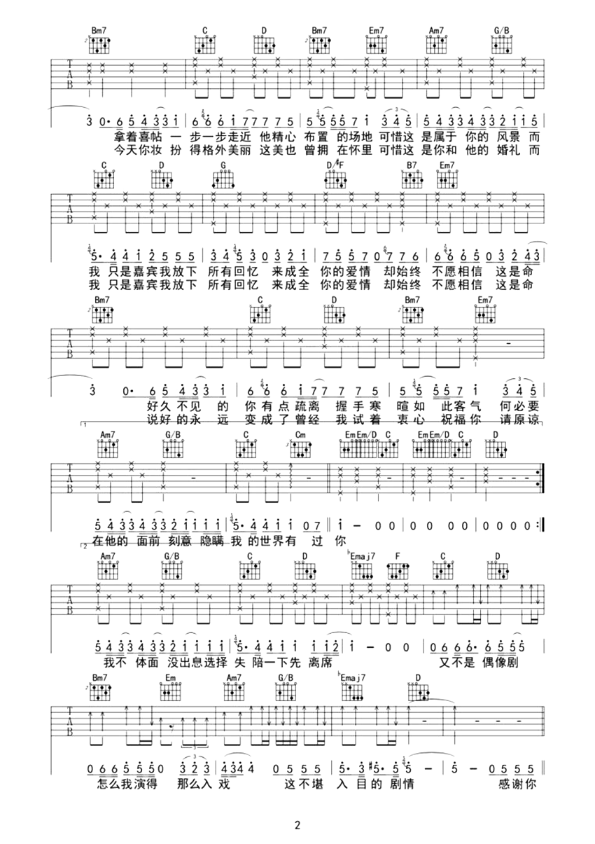 曲谱介绍: 嘉宾吉他谱,张远演唱的热门网络歌曲,满满的回忆充斥在头脑,而却成为你和别人婚礼的“嘉宾”,这样的场景除了剧本是谁也不敢想的,张远用深情的演绎方式诠释了这个模糊的关系,让我们感慨到一句话:你的婚礼,也许对于我来说是一个新的开始吧。 《嘉宾》吉他弹唱谱,选用G调指法编配,原调A调,CAPO夹2品弹唱原调,共3张高清PNG纯净原版六线谱,还原度:85%,弹唱难度:2级。