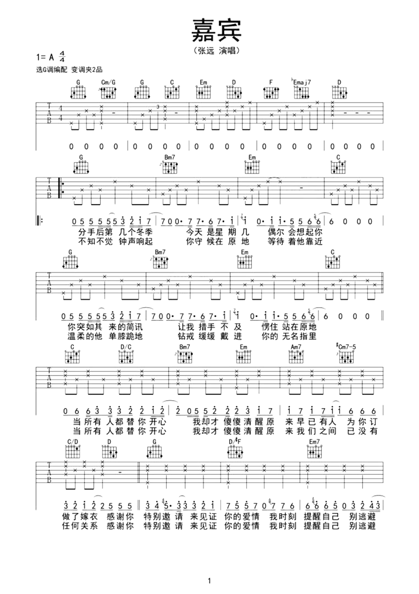 嘉宾吉他谱 - 张远 - G调吉他弹唱谱 - 原版