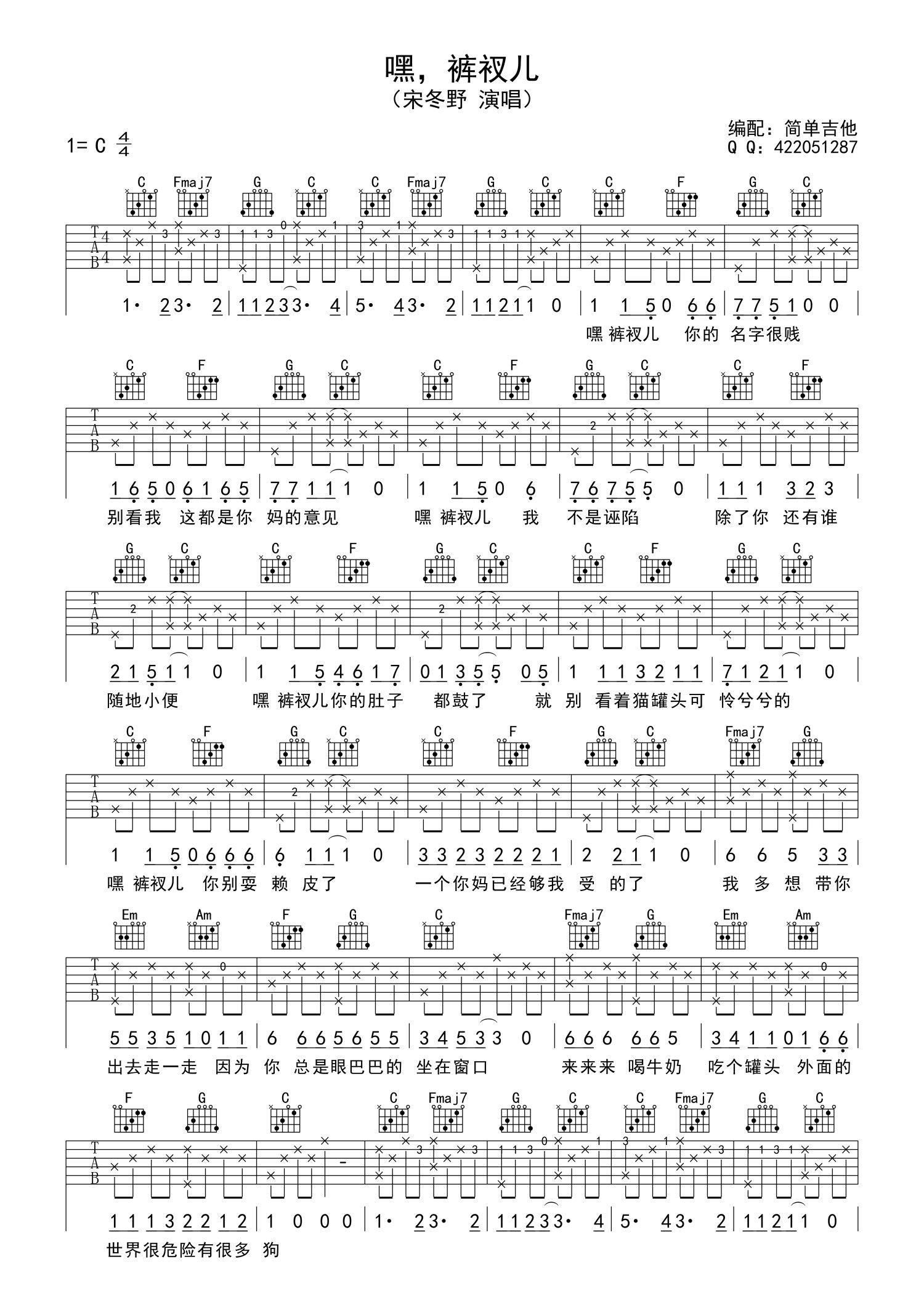 曲谱介绍: 宋冬野《嘿,裤衩儿》吉他谱_C调吉他弹唱谱