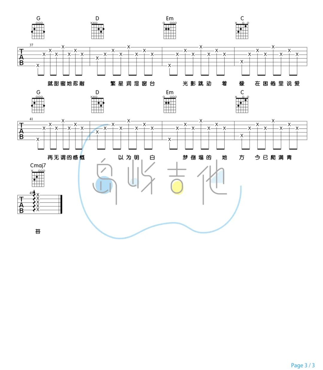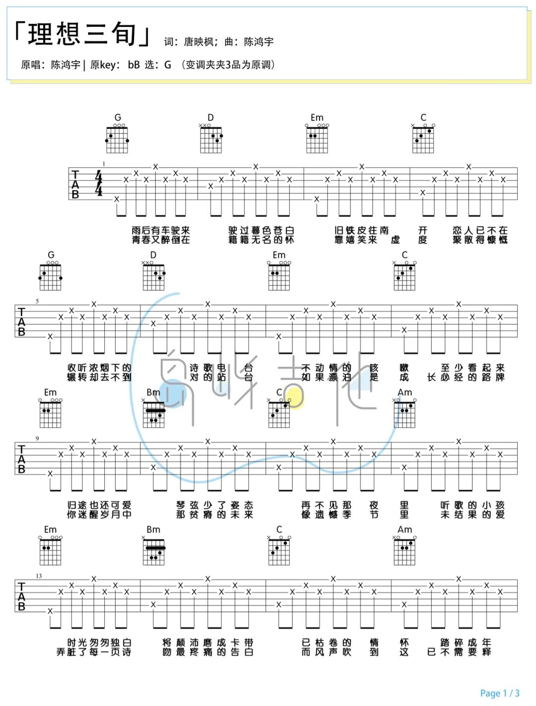 曲谱介绍: 理想三旬吉他谱,陈鸿宇演唱,轻缓的咬字唱腔,更多的诠释着现实与理想差异中的一些无奈 《理想三旬》吉他弹唱谱,选用G调指法,原调bB,CAPO夹3品弹唱原调,本谱为简单的分解和弦右手节奏弹唱,新手很容易上手,弹唱难度:1级,共3张六线谱,附1张和弦谱图例。