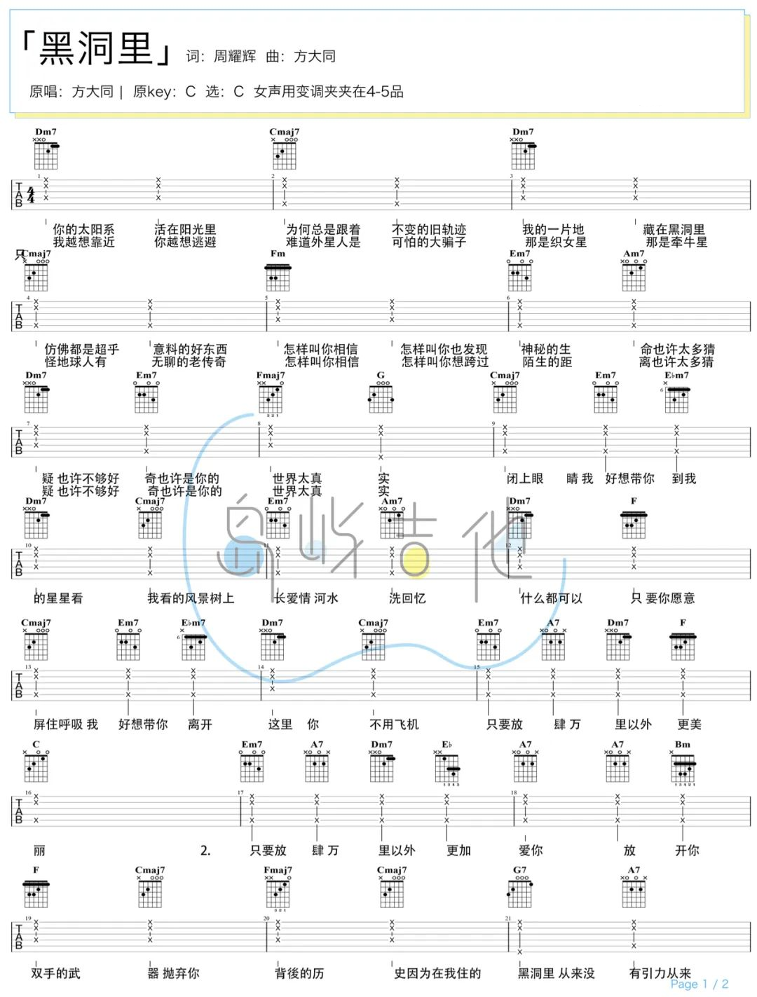 曲谱介绍: 黑洞里吉他谱,方大同演唱的歌曲,歌曲用“黑洞里”形容着感情里的拉扯,在爱的宇宙里,各自拥有不同的内心色彩,歌曲诠释着自己在黑暗心境中的无奈与难过的感受。 《黑洞里》吉他弹唱谱,选用C调指法,标准调音,男生无需使用变调夹,女生CAPO夹4-5品,本谱共2张高清六线谱+1张和弦谱,比较简单适合新手练习,难度:1级。