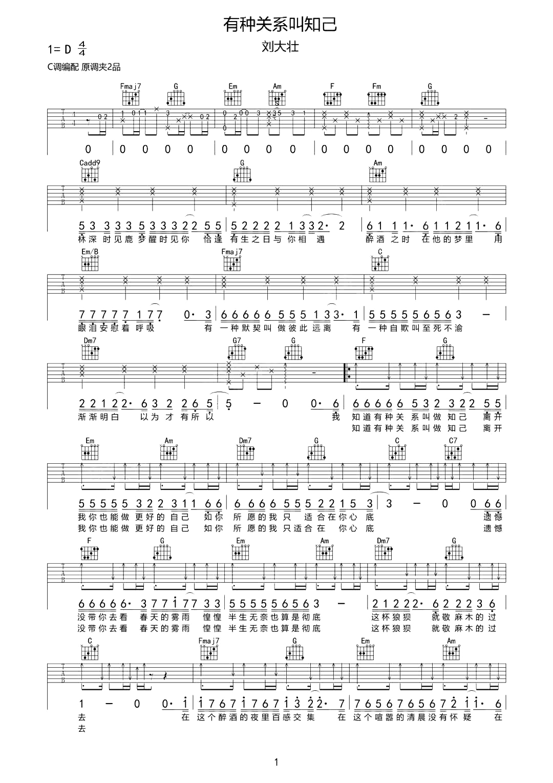 有种关系叫知己吉他谱 - 刘大壮 - C调吉他弹唱谱 - 原版