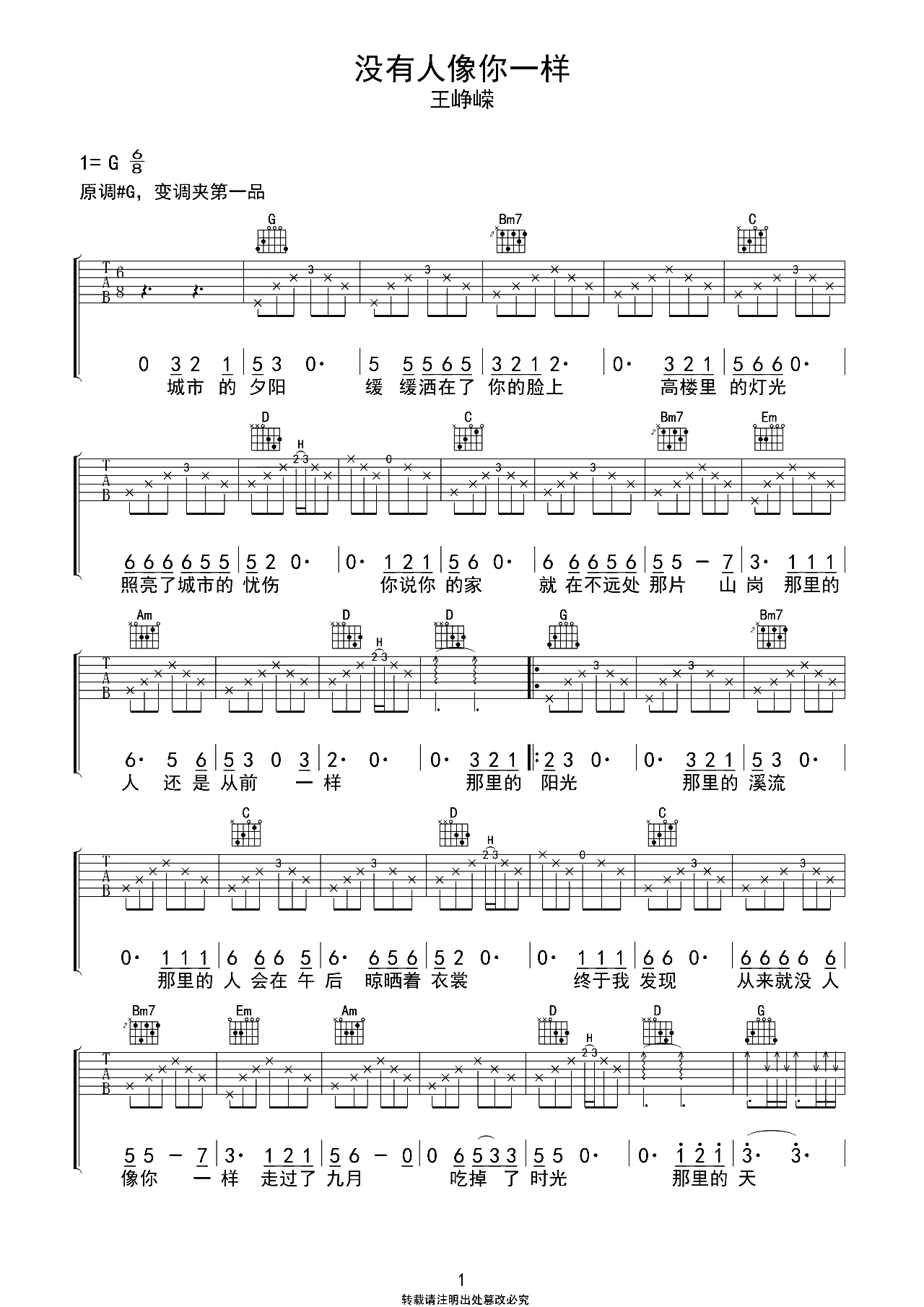 没有人像你一样吉他谱 - 王峥嵘 - G调吉他弹唱谱 - 原版