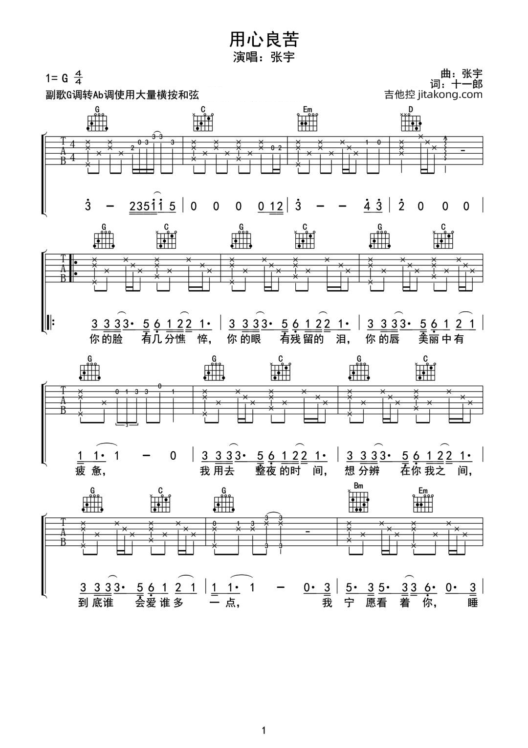 用心良苦吉他谱 - 张宇 - G调吉他弹唱谱 - 原版