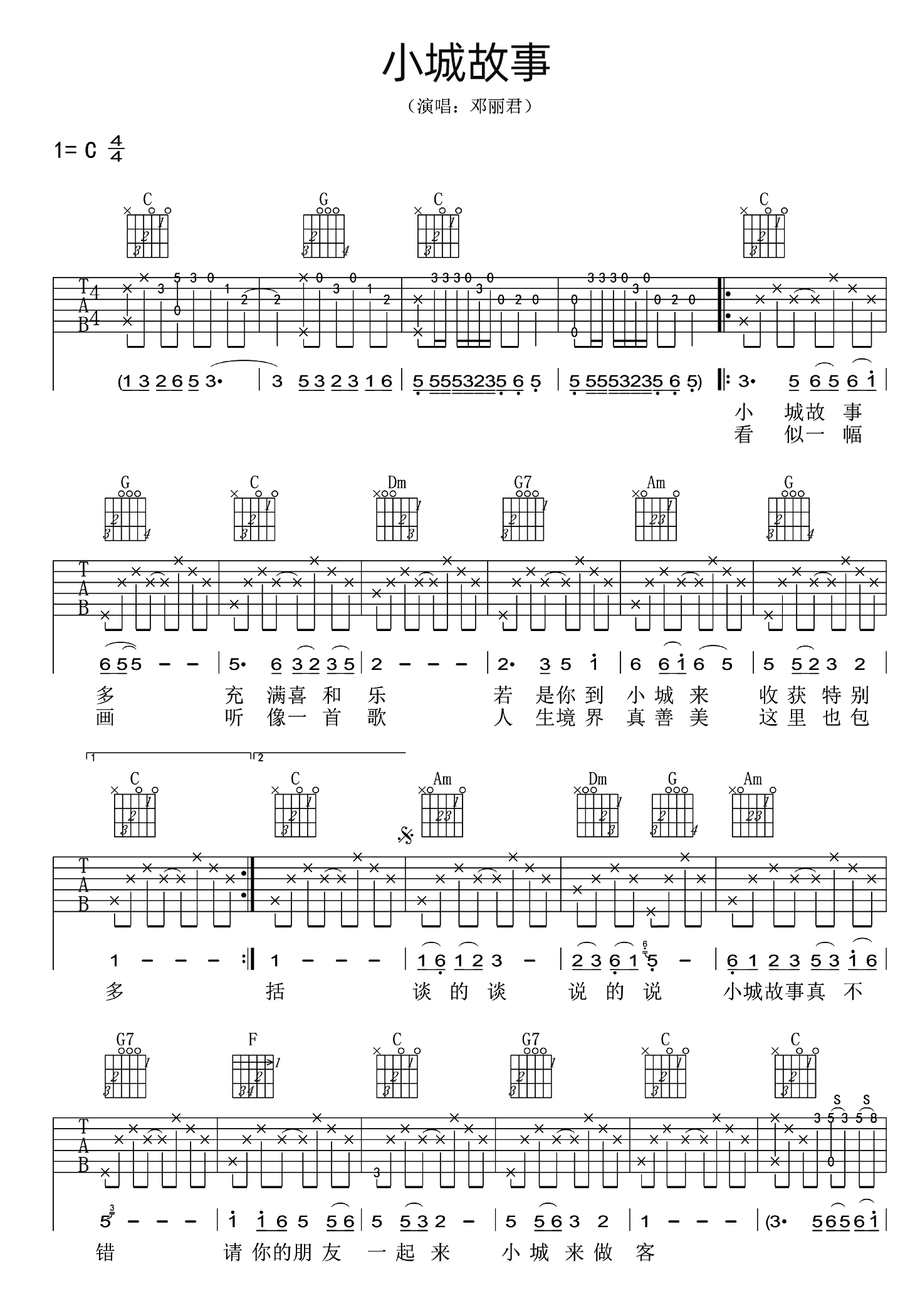 小城故事吉他谱 - 邓丽君 - C调吉他弹唱谱 - 原版