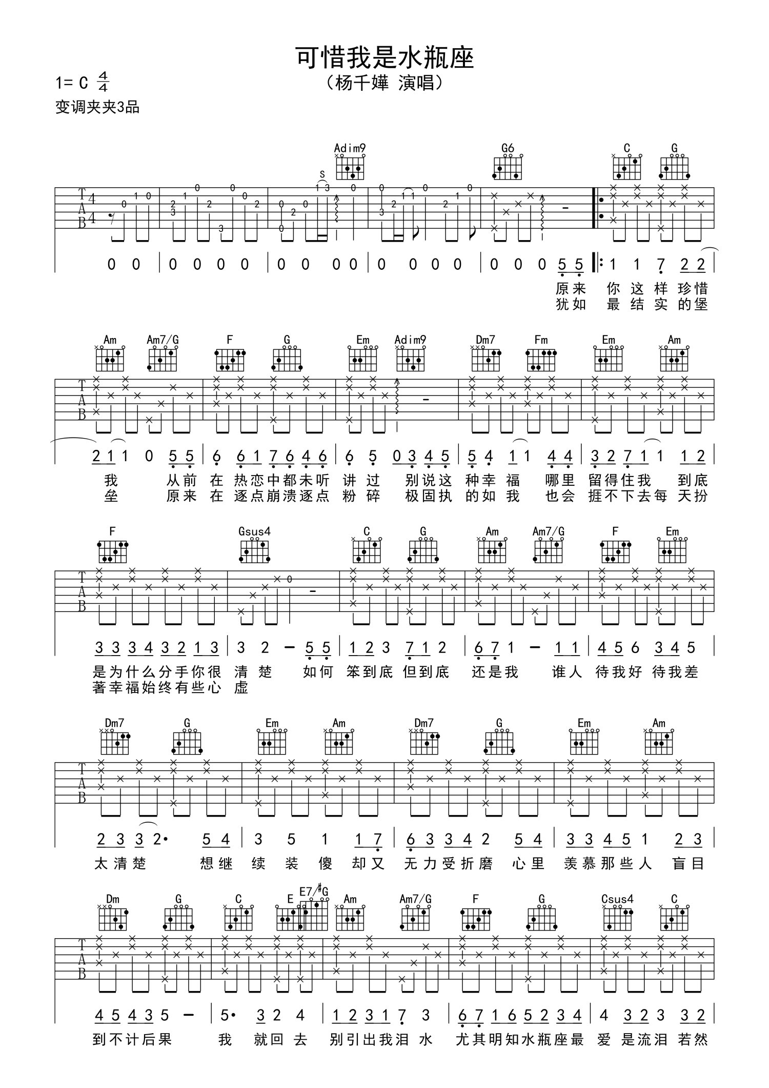曲谱介绍: 杨千嬅《可惜我是水瓶座》吉他谱_C调吉他弹唱谱
