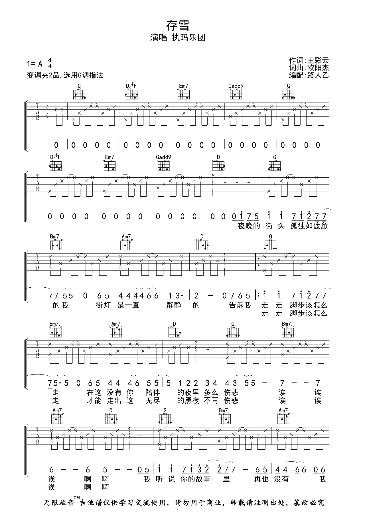 存雪吉他谱 - 执玛乐队 - G调吉他弹唱谱 - 原版