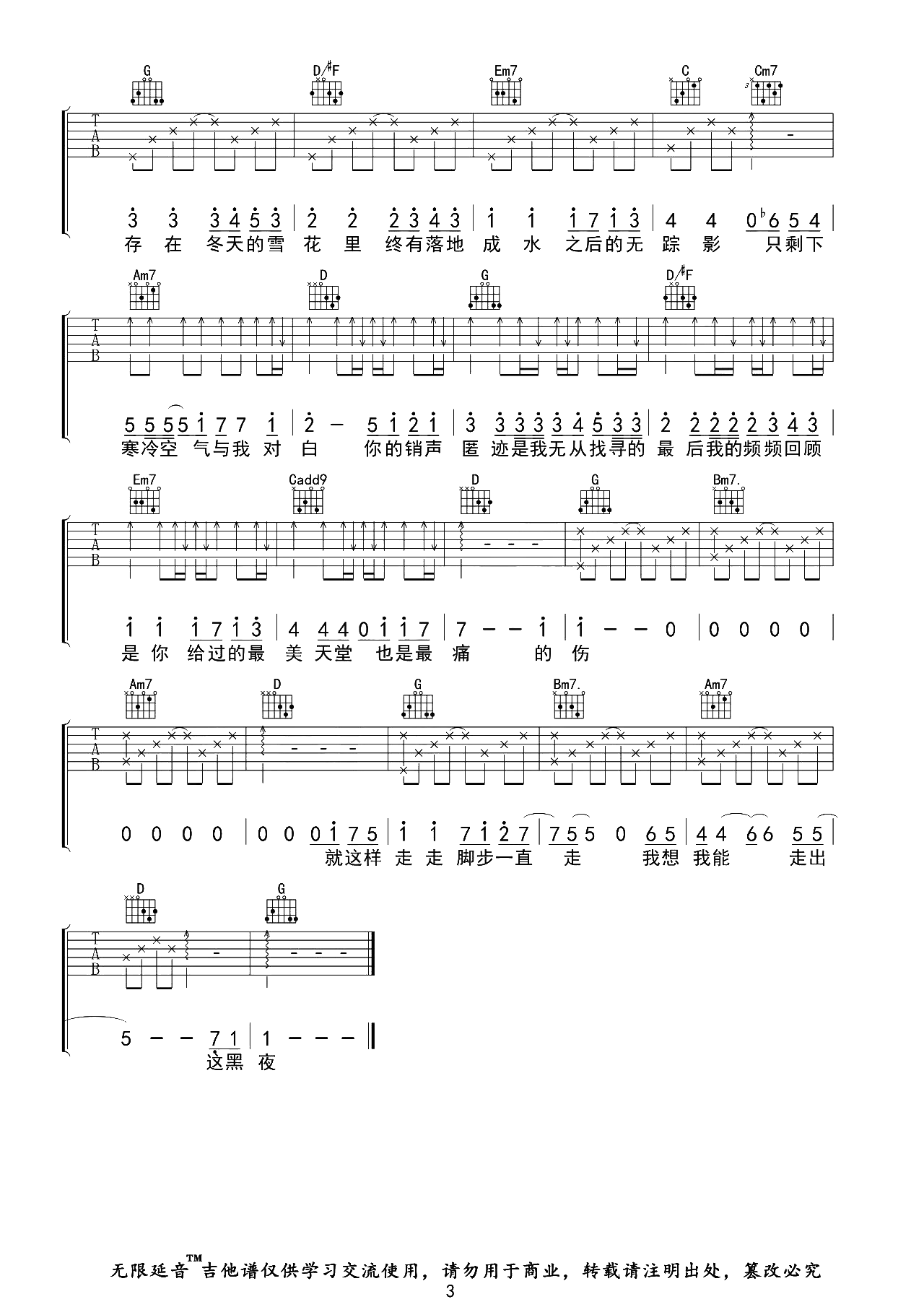 曲谱介绍: 存雪吉他谱分享,是由执玛乐队演唱的伤感歌曲,孤独疲惫充斥着生活,而你的影子在我心中无法挣脱,但离去的身影还在脑海中反复折磨,整个冬季从来没有温暖过,内心的冰冷依旧封存,只剩下冷空气与自我的对白。 《存雪》吉他弹唱谱,共3张高清PNG图片谱例,选用G调指法,原调A调,CAPO夹2品弹唱原调,原版比例:85%,难度:2级。