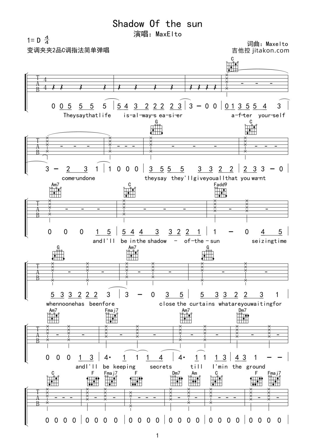 曲谱介绍: Shadow of the sun吉他谱,MaxElto演唱的英文歌曲,选用C调指法,原调D调,CAPO夹2品弹唱原调,共3张高清PNG六线谱图例,弹唱难度:2级简单。 空灵般的嗓音带着微微嘶哑,MaxElto仿佛让我们感受到了光影下的自己,沉静而又从容,仿佛看到了属于自己的未来。