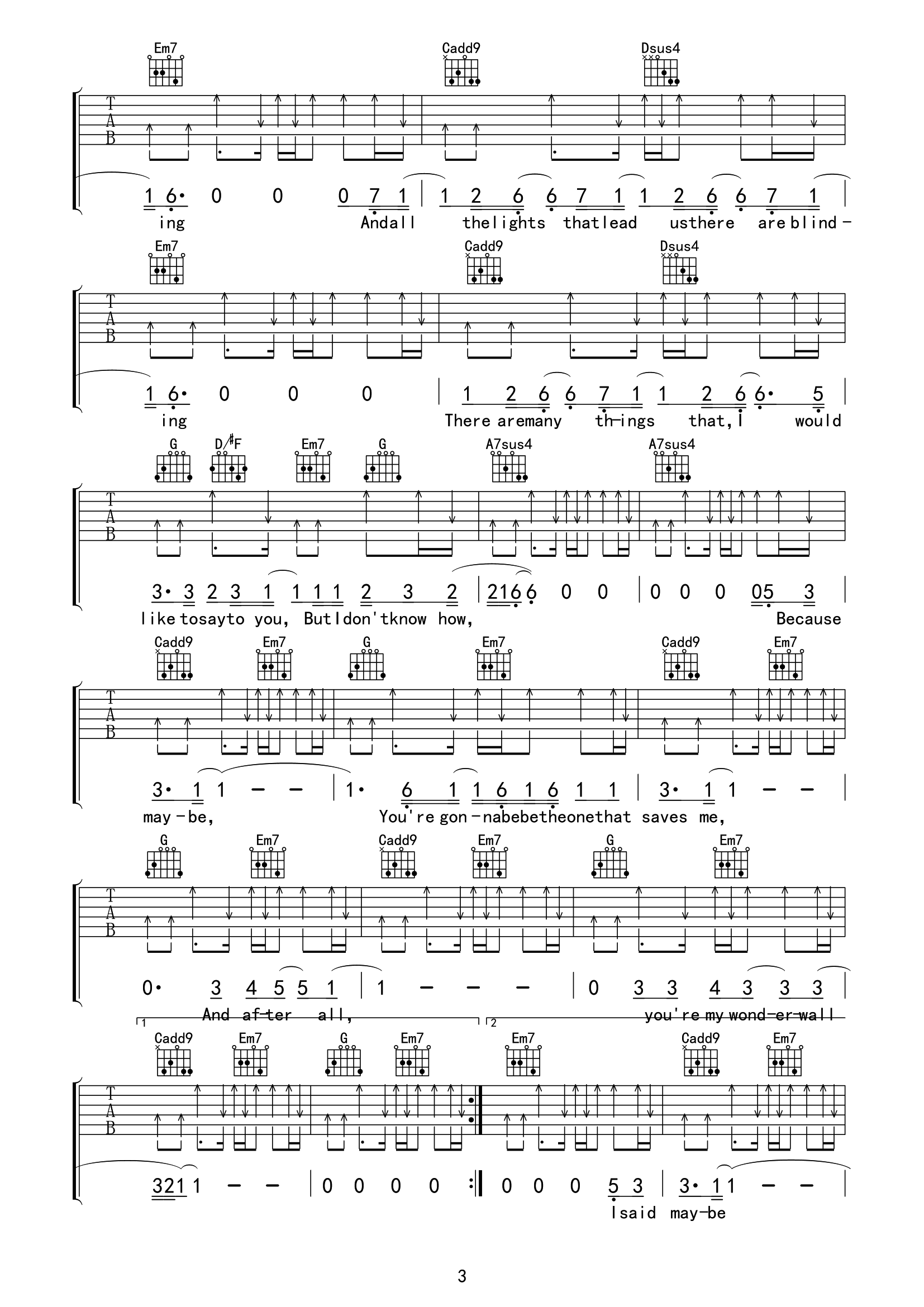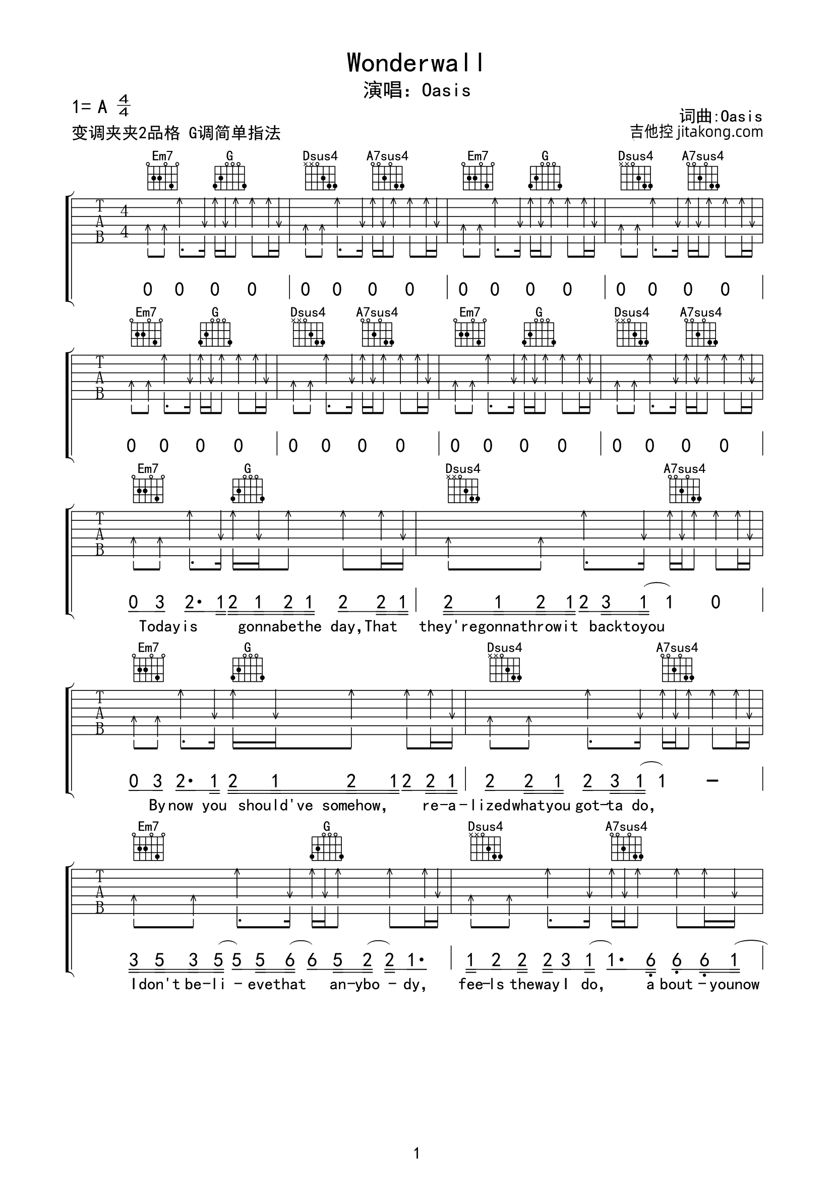 曲谱介绍: Wonderwall吉他谱,Oasis(绿洲乐队)演唱的英文歌曲,原汁原味的木吉他扫弦英文歌曲,在这种英式摇滚味的节奏中,我们感受到了很纯粹的状态,无论时隔多久,这首歌的传唱度依然是如此的经典。 《Wonderwall》吉他弹唱谱,选用G调指法,原调A调,CAPO夹2品可弹唱原调,共4张高清PNG图片谱,难度:4级较简单,弹唱提示:本谱和弦难度不大,扫弦节奏需要注意一下附点部分的层次感。
