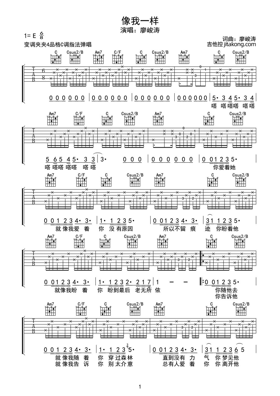 像我一样吉他谱 - 廖峻涛 - C调吉他弹唱谱 - 原版