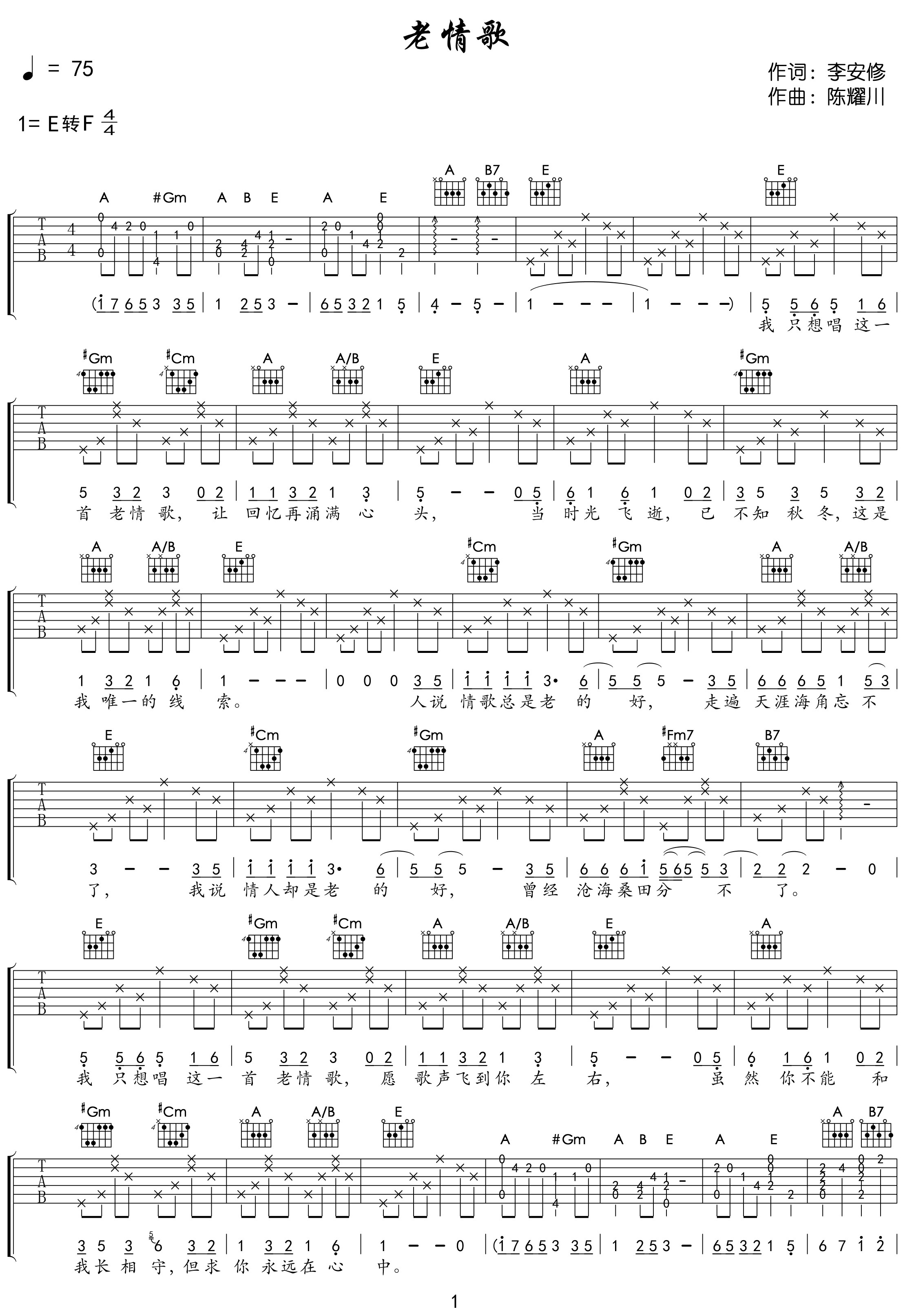 曲谱介绍: 老情歌吉他谱,李安修作词,陈耀川作曲,吕方演唱的一首老歌,舒缓的旋律,如同歌名一般,是承载着关于时光的记忆,总是会给人一种莫名的共鸣,让人铭刻联想翩翩… 《老情歌》吉他弹唱谱,选用E转F调,节奏4/4拍,速度75BPM,弹唱无需使用变调夹,难度:4级较简单。