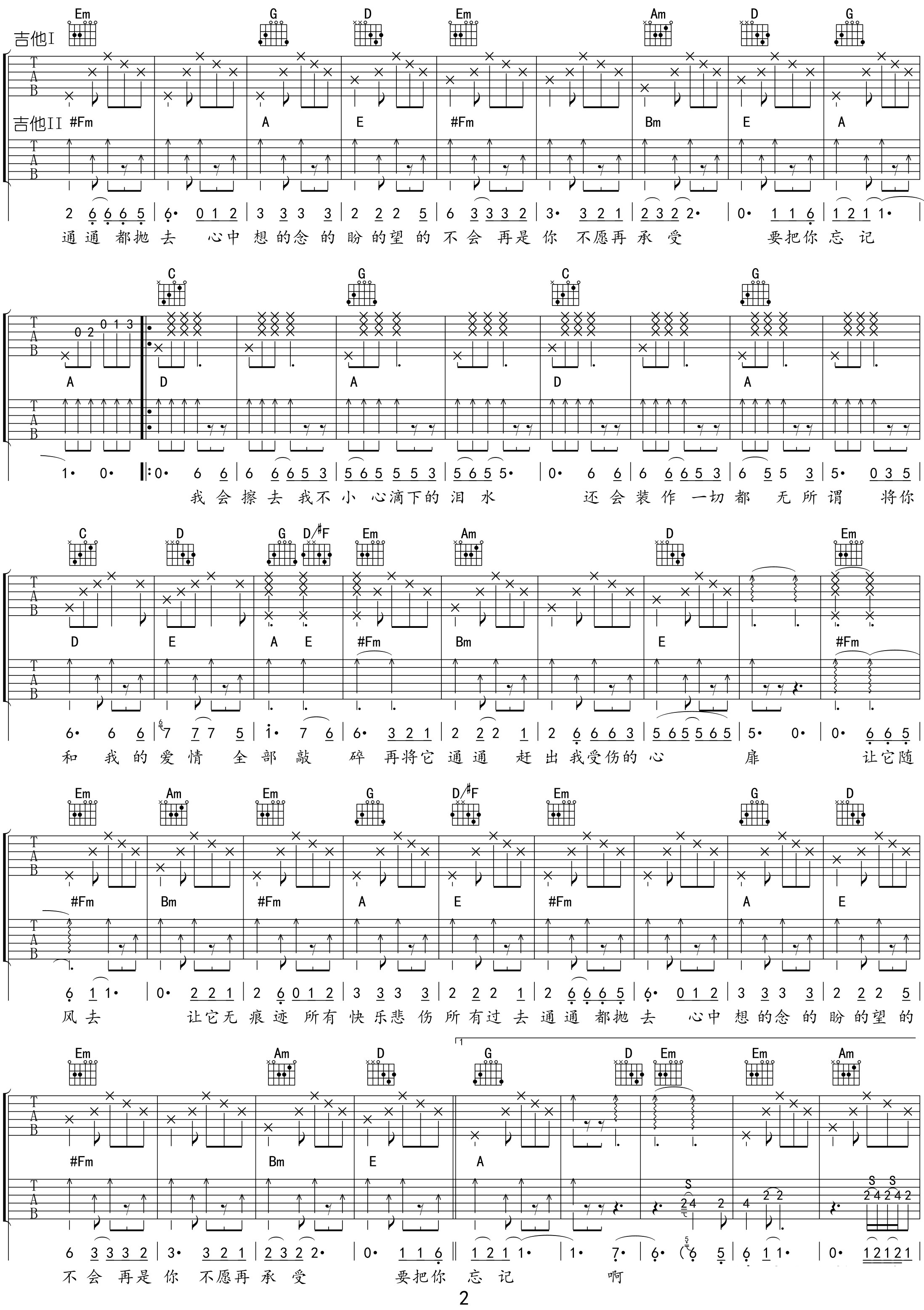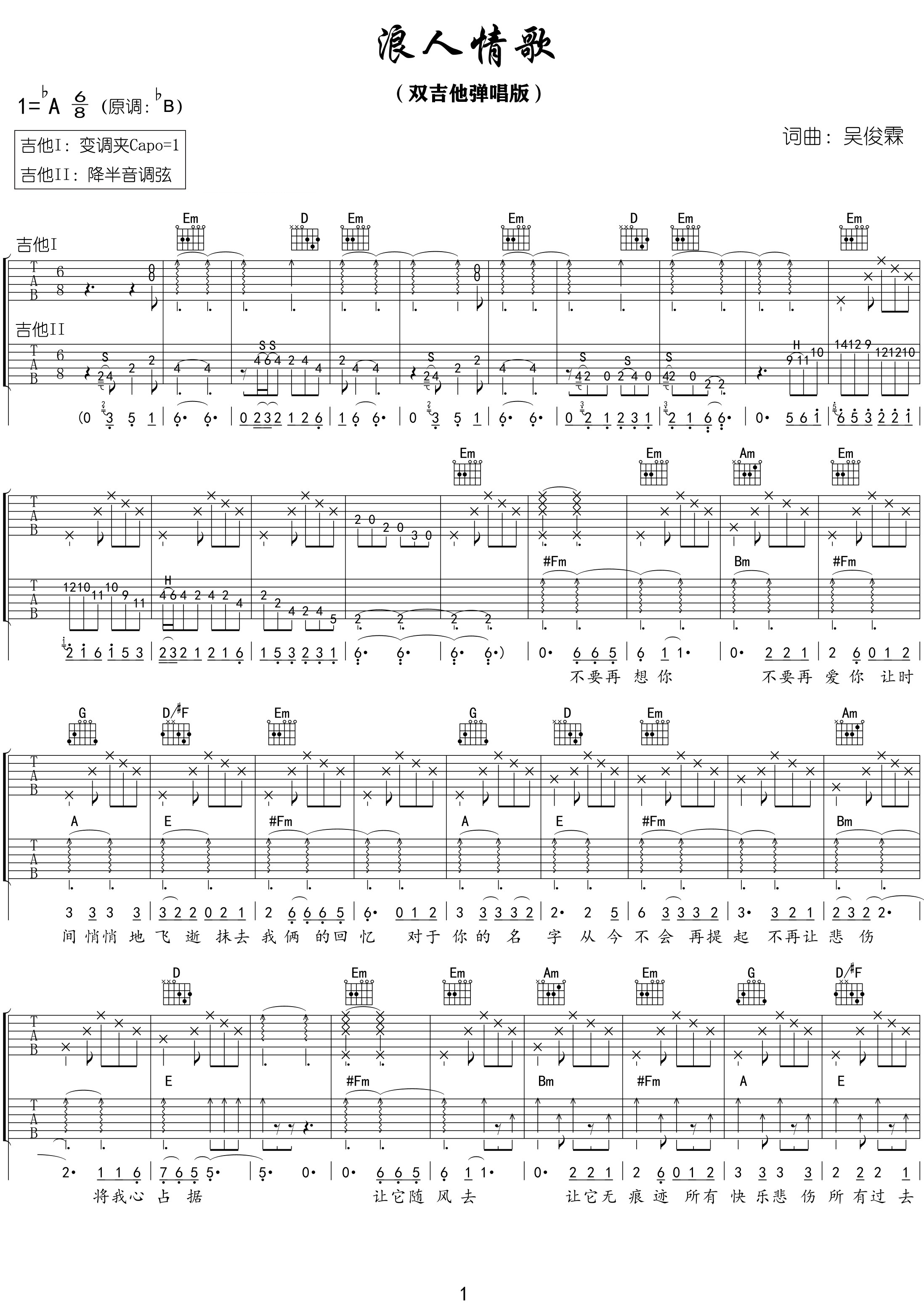 曲谱介绍: 浪人情歌吉他谱,伍佰演唱,时间飞逝,那些不愿提起的伤痛回忆从今记起,消除所有的“关于你”,不再提及,这首歌一字一句都诠释着对过往人与事的梳理,以及重新梳理自己的悲伤情绪,明天还有更多的事值得我们去奔赴与争取。 《浪人情歌》吉他弹唱谱,选用bA调,节奏6/8拍,原调bB,双吉他编配,关于变调夹的情况,吉他一轨,变调夹需夹1品,二轨则需要降半音调弦,弹唱难度7级较难。