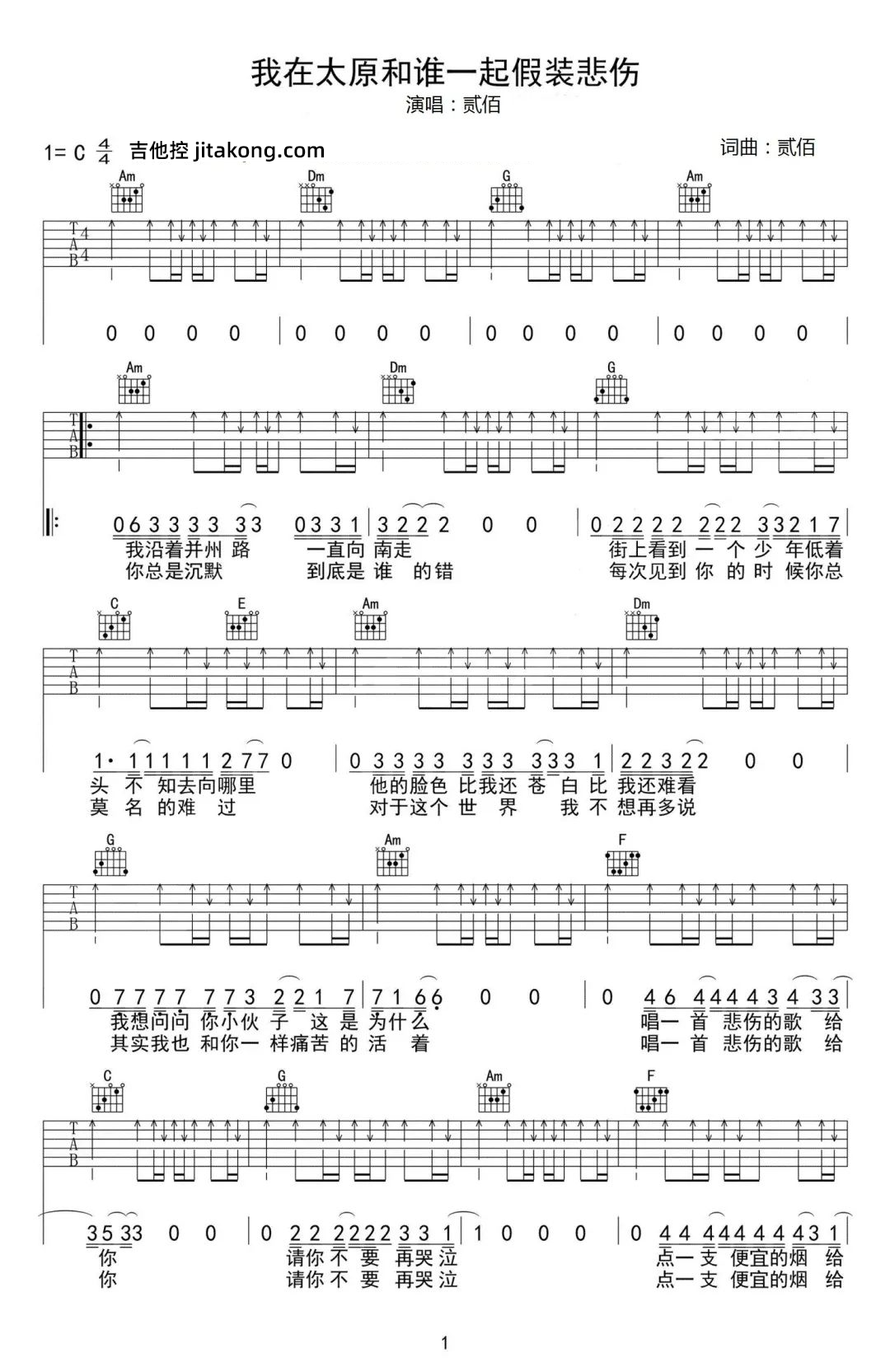 我在太原和谁一起假装悲伤吉他谱 - 贰佰 - C调吉他弹唱谱
