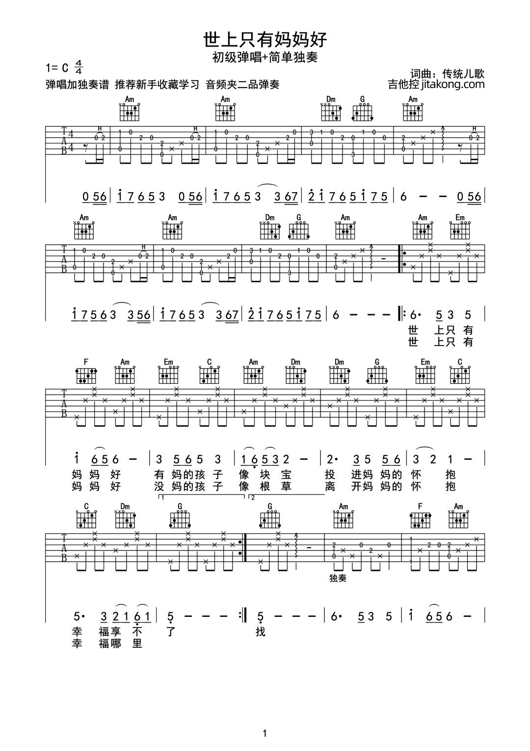 世上只有妈妈好吉他谱 - 带前奏/尾奏 - C调吉他弹唱谱 - 原版
