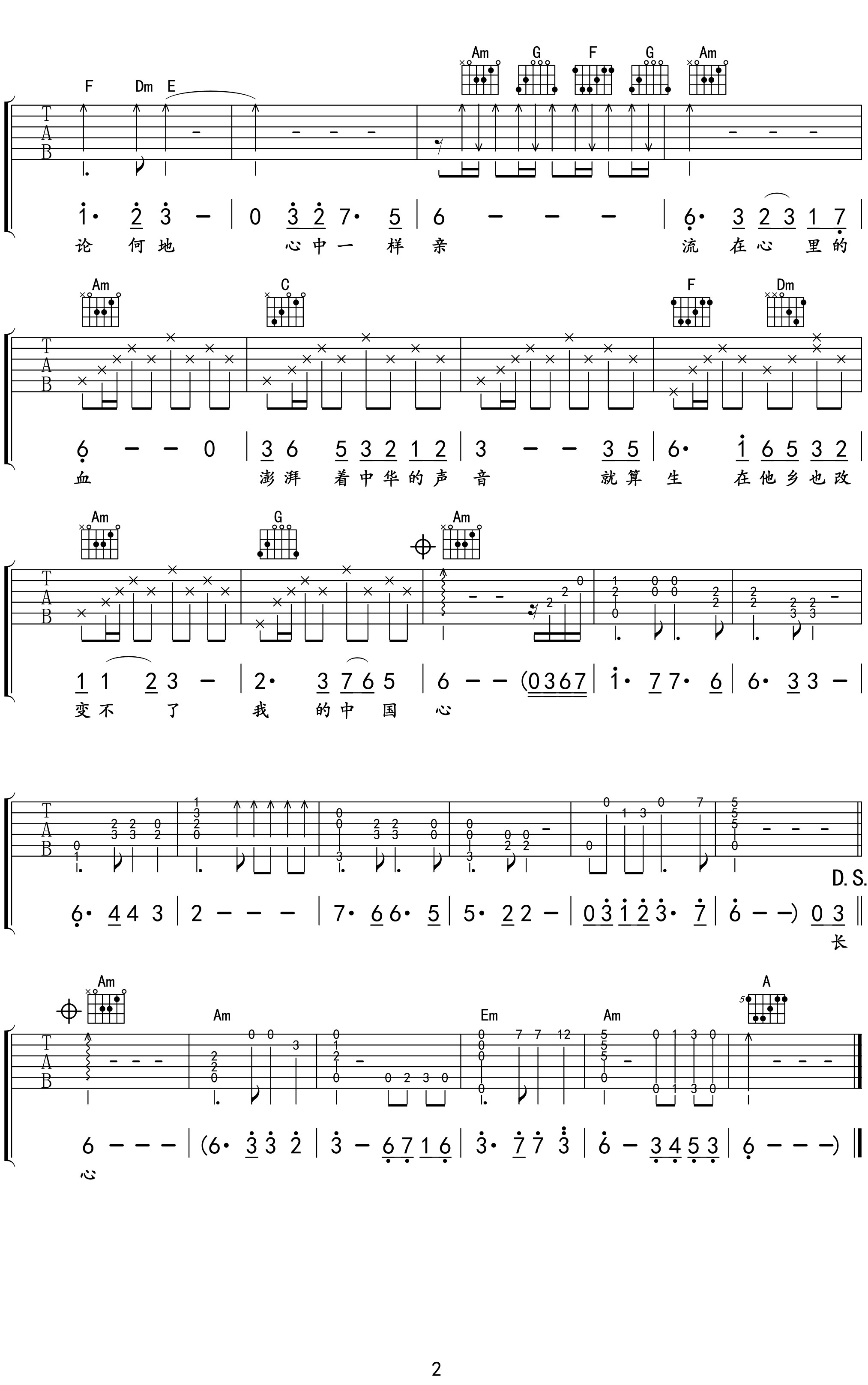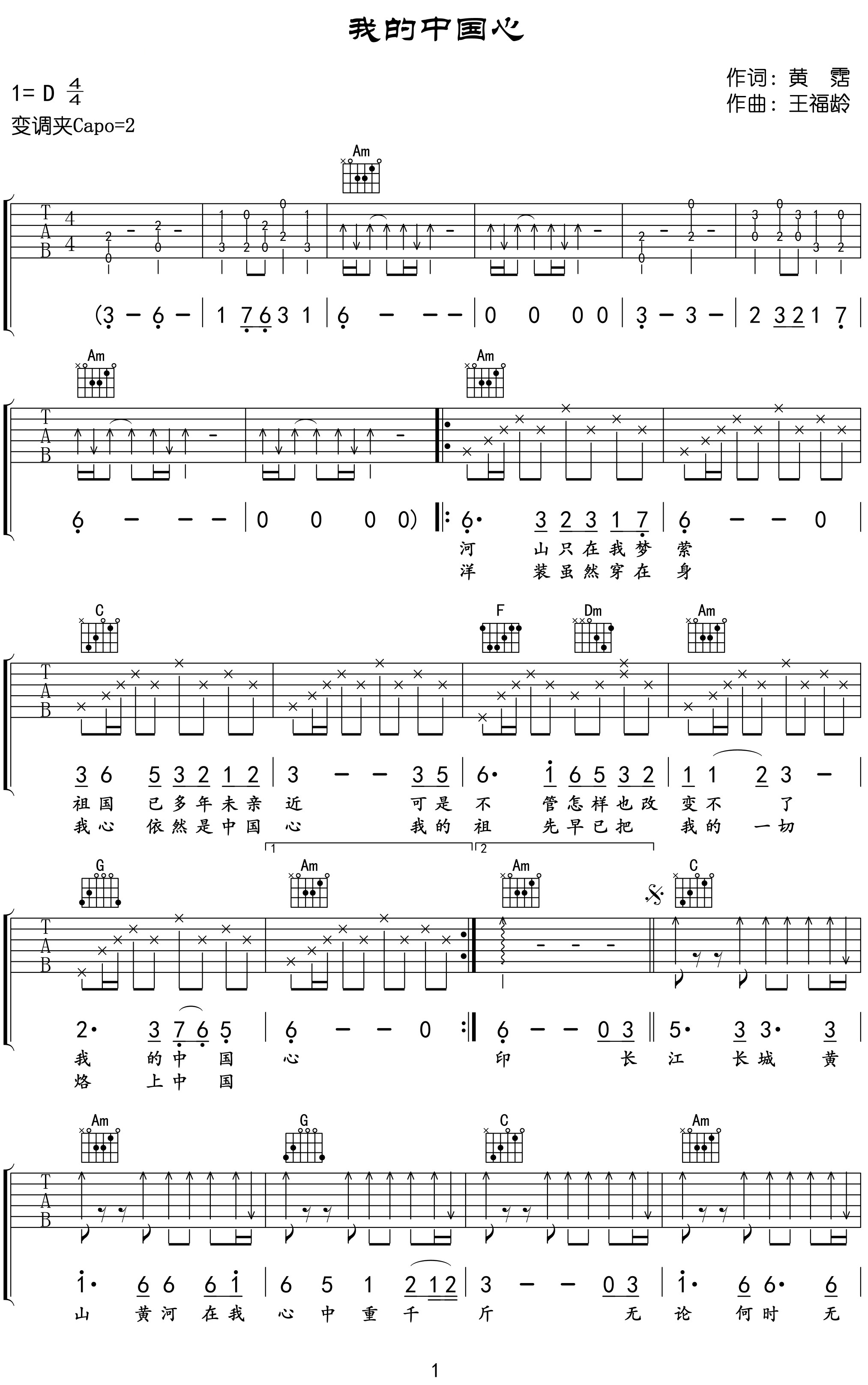 曲谱介绍: 我的中国心吉他谱,张明敏的一首代表作品,怀揣着爱国的信仰,每个人都有一颗“中国心”,点燃中国心,照进百年梦,歌曲用壮志凌云的编曲诠释着每个黄种人相亲相爱的精神。 我的中国心吉他弹唱谱,选用C调指法编配,原调D调,CAPO夹2品弹唱原调,节奏4/4拍,本谱含前奏和尾奏,按原版编配,难度:3级较简单。