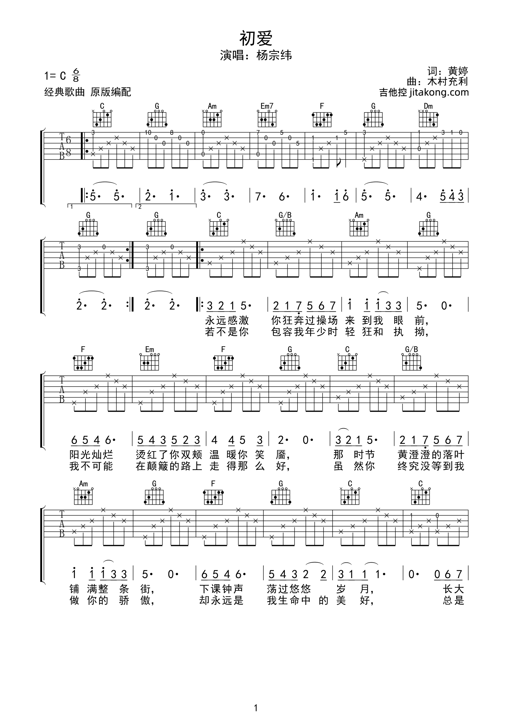 初爱吉他谱 - 杨宗纬 - C调吉他弹唱谱 - 原版