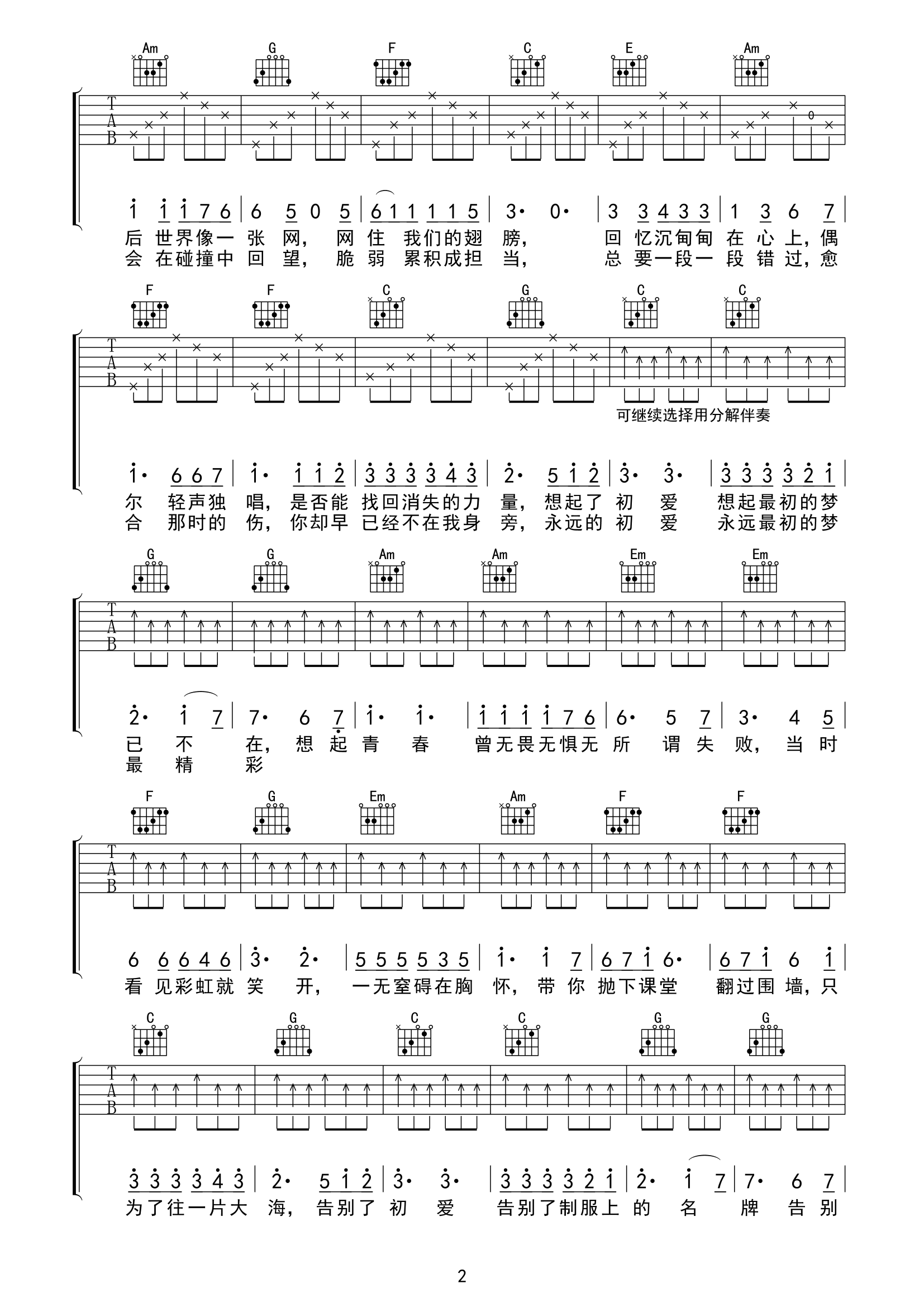 曲谱介绍: 初爱吉他谱,杨宗纬演唱,畅快的旋律洋溢着青春时光的气息,歌曲满满的是关于校园恋情的记回忆与感慨,初恋总是朦胧又让人心动,曾经最美的期待如今都已不再,但这样的感觉永远铭刻在内心最深处。 初爱吉他弹唱谱,选用C调指法,可以根据自己的嗓音条件来调整变调夹,节奏6/8拍,速度略快所以弹唱时候需要注意一下,难度:3级较简单。