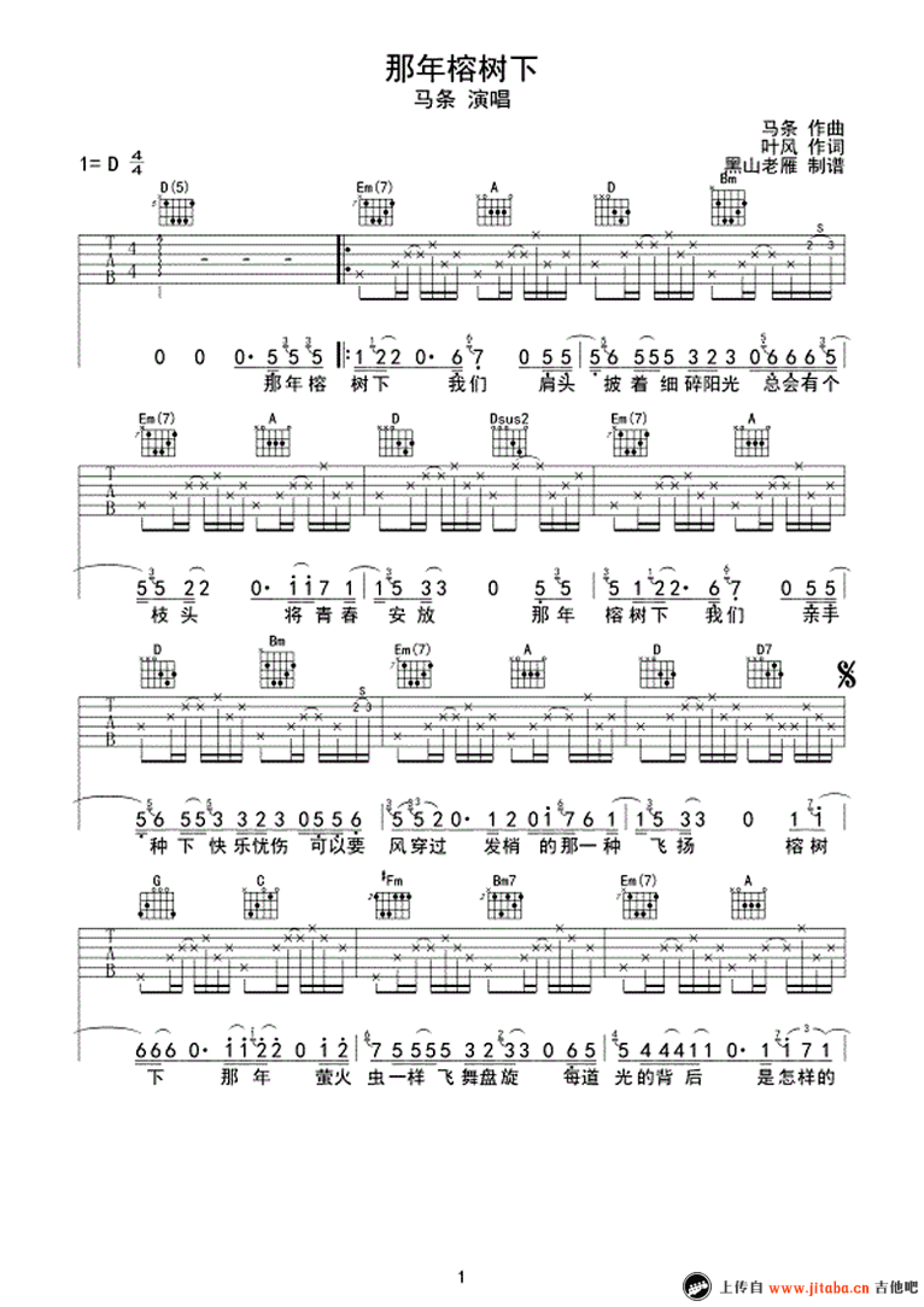 那年榕树下吉他谱 - 马条 - D调吉他弹唱谱