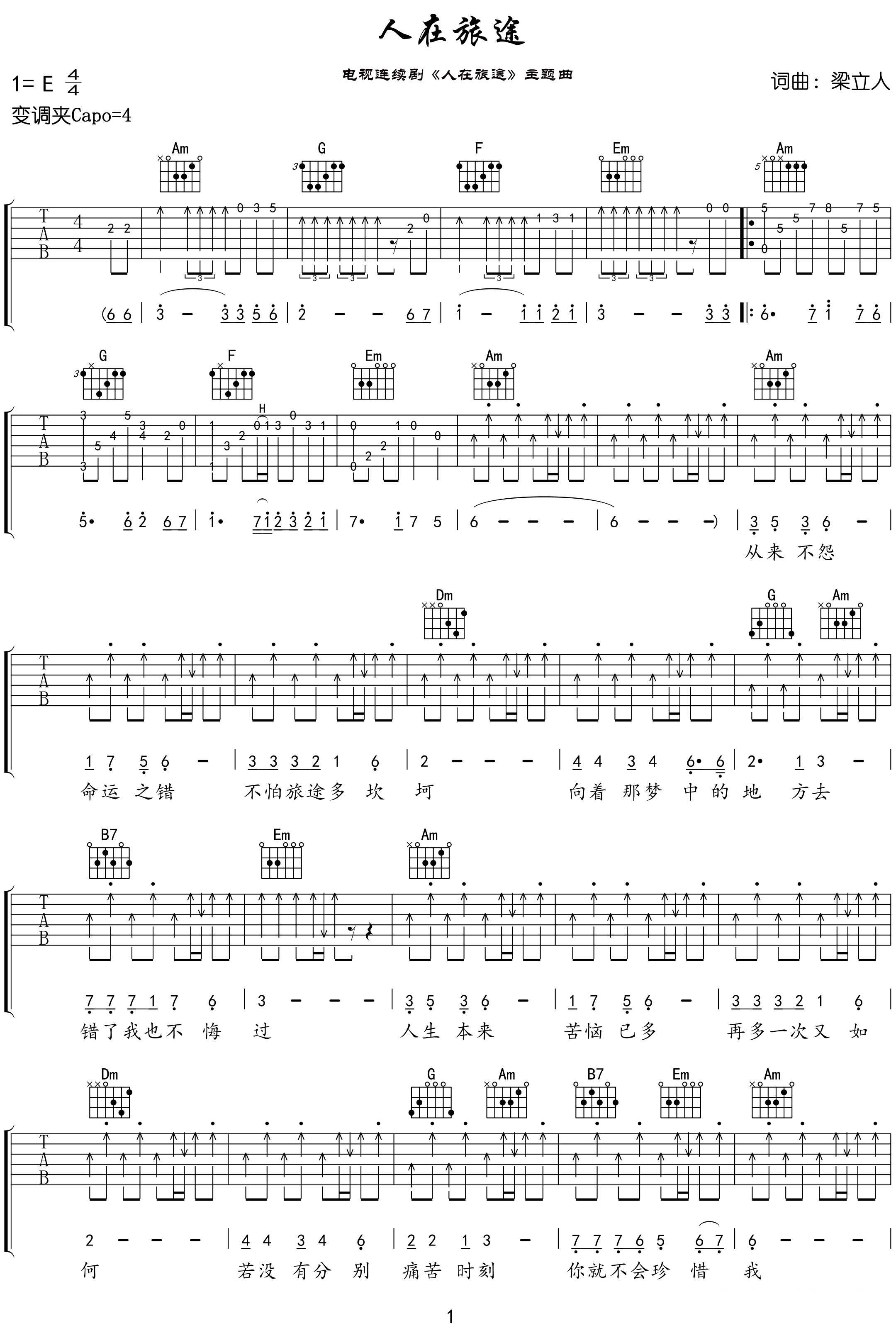 曲谱介绍: 人在旅途吉他谱,翁素英演唱同名电视剧主题曲,由梁立人作词作曲 《人在旅途》吉他弹唱谱,选用C调指法编配,原调E调,CAPO夹4品弹唱原调,含前奏,原版编配,难度:5级适中,扫弦部分涉及到切音技巧,也是新手不好掌握的技巧。