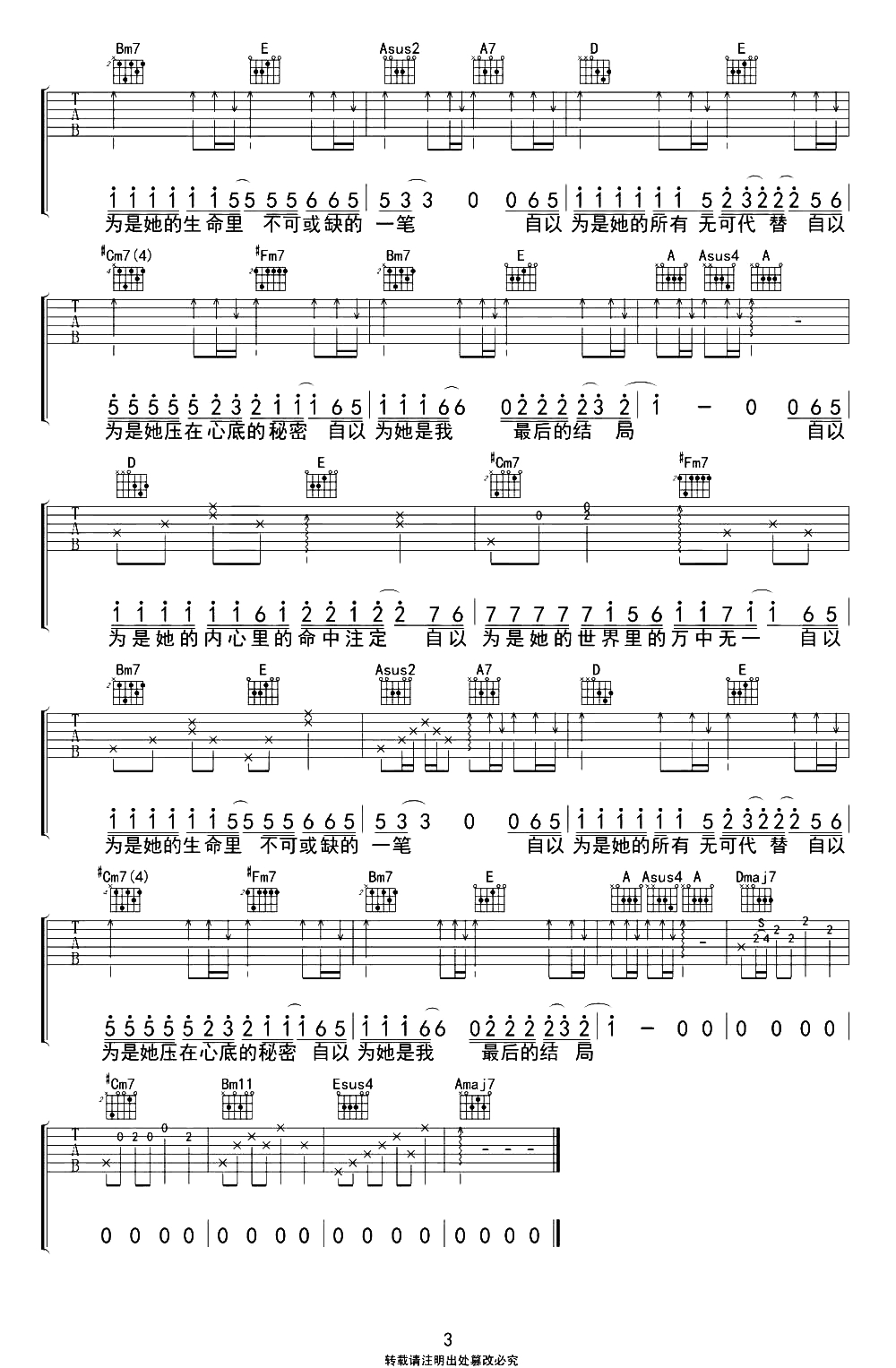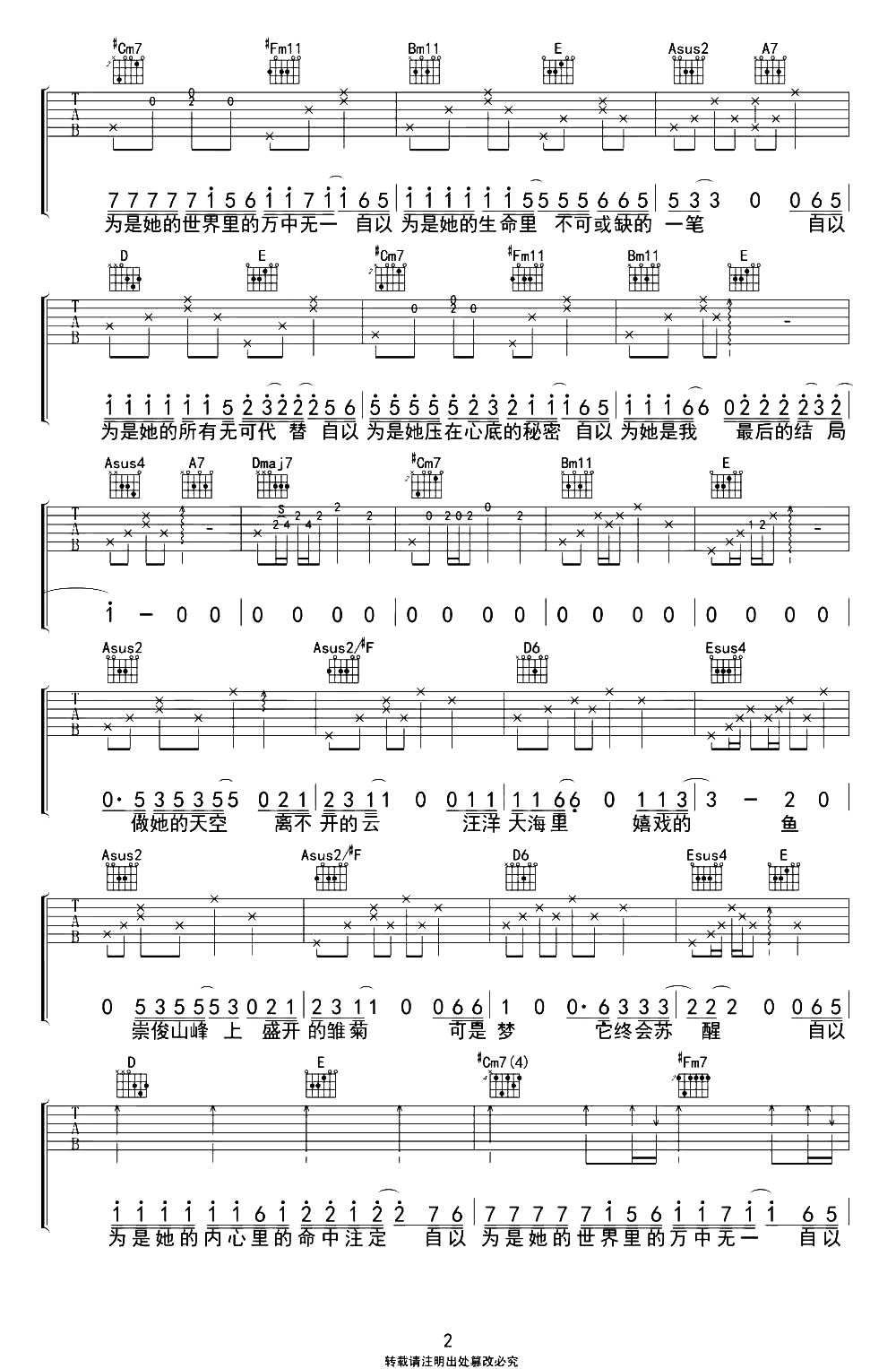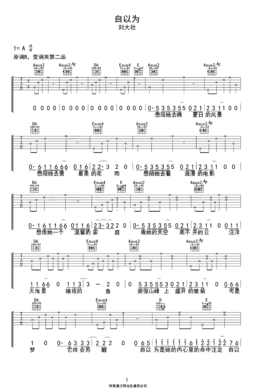 曲谱介绍: 《自以为》吉他弹唱谱,选用A调指法,原调B调,CAPO夹2品弹唱原调,典型的吉他民谣歌曲走势,难度:2级简单,新手也可以很好的还原弹唱。