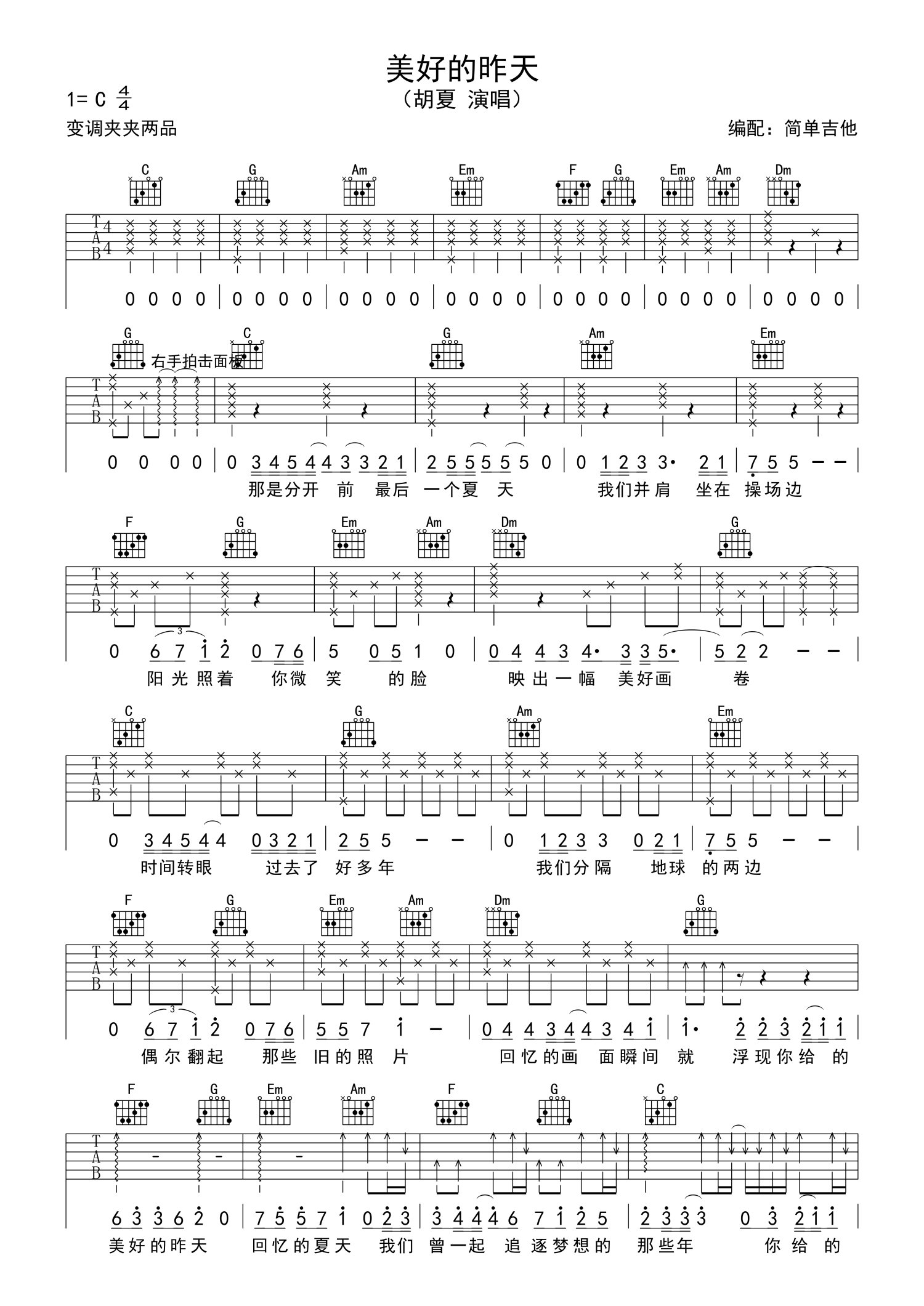 曲谱介绍: 胡夏《美好的昨天》吉他谱_C调吉他弹唱谱