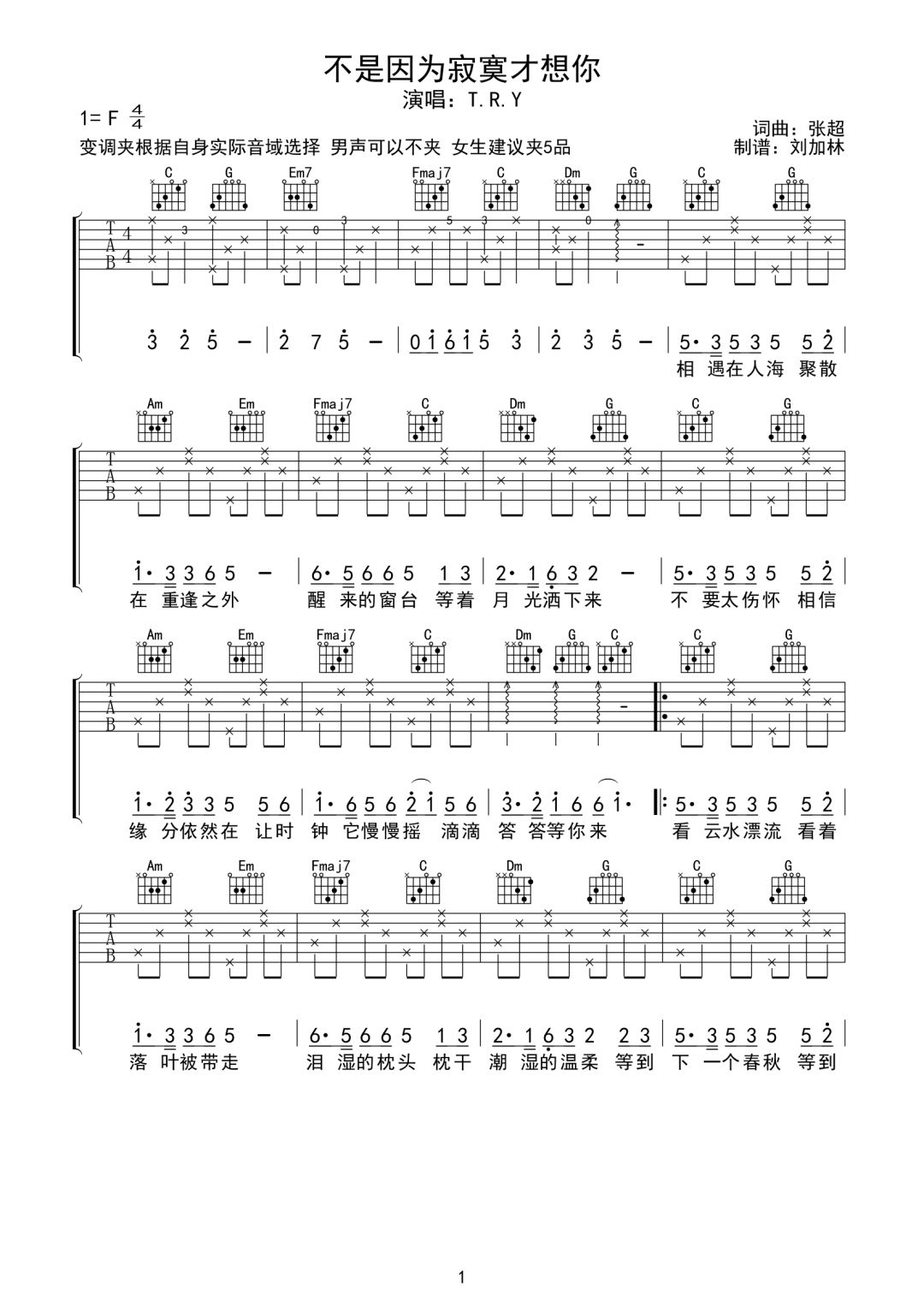 曲谱介绍: 不是因为寂寞才想你吉他谱,T.R.Y组合原唱的一首情歌,随着时光的回流,我们找到了这首歌最初的时候,这首歌温柔绵长却记录了大家熟悉的回忆,相遇之后的聚散总是难免,而想你才是唯一的寂寞。 不是因为寂寞才想你吉他弹唱谱,选用C调指法,原调F,CAPO夹5品弹唱原调,含完整前奏,按原版编配,弹唱难度:2级较简单。