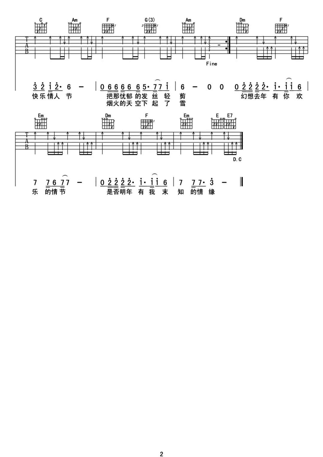 曲谱介绍: 没有情人的情人节吉他谱,孟庭苇演唱的歌曲,这首歌唱出了多少因爱情的失落引发的情绪,没有情人的情人节,让人充斥着落寞的感觉,无尽的等待与期盼,最终独自感慨,就让这样的感触早点消散,祝自己“情人节快乐”吧! 《没有情人的情人节》吉他弹唱谱,选用C调指法编配,可根据自己嗓音调整变调夹位置,标准的分解和弦,难度:3级较简单,在曲谱第13小节出现下扫切音,如果你想简单一点可用扫弦带过。