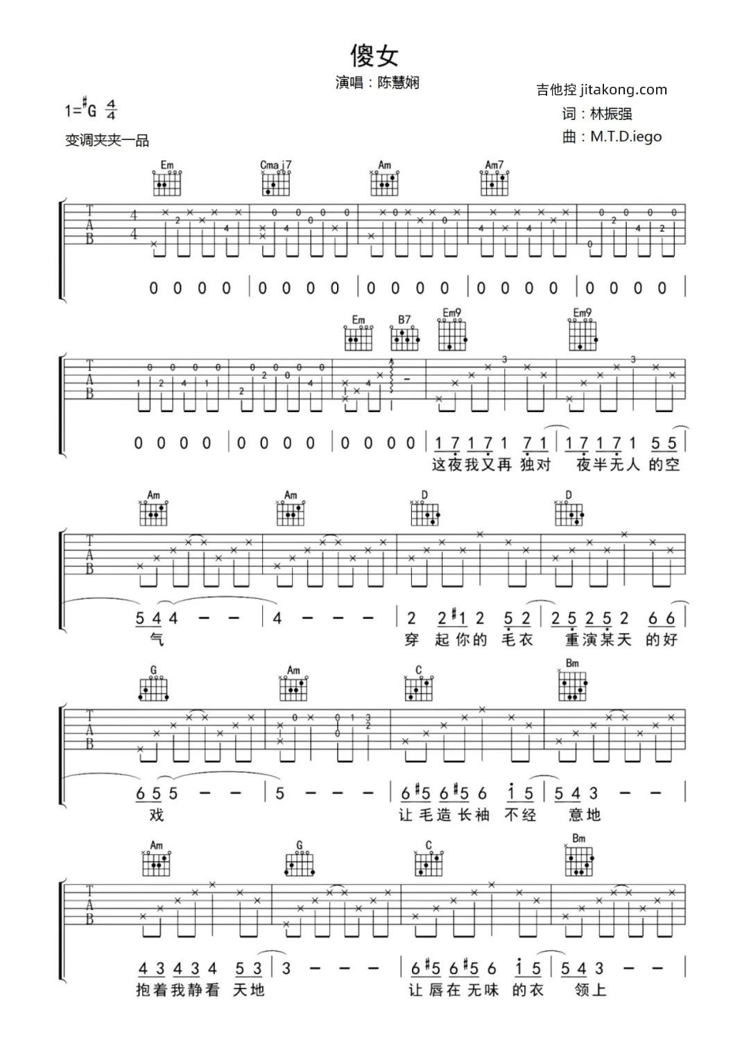 曲谱介绍: 傻女吉他谱,陈慧娴演唱的粤语歌曲,故事中的情绪层层递进,再美丽的感情如花一般终将凋谢,歌曲将女人的傻傻奉献诠释得淋漓尽致,但有的时候情感不就是这样,所有的不顾一切全是为了遵循内心。 《傻女》吉他弹唱谱,选用G调指法,原调#G,CAPO可以夹1品弹唱原调,含前奏按原版编配,共有4张高清图片谱,弹唱难度:3级较简单。