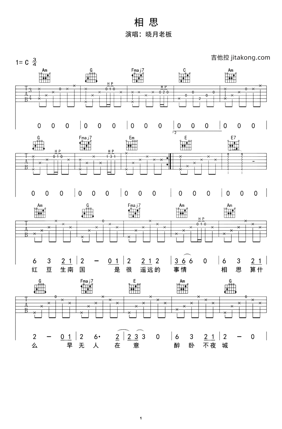 相思吉他谱 - 晓月老板 - C调吉他弹唱谱