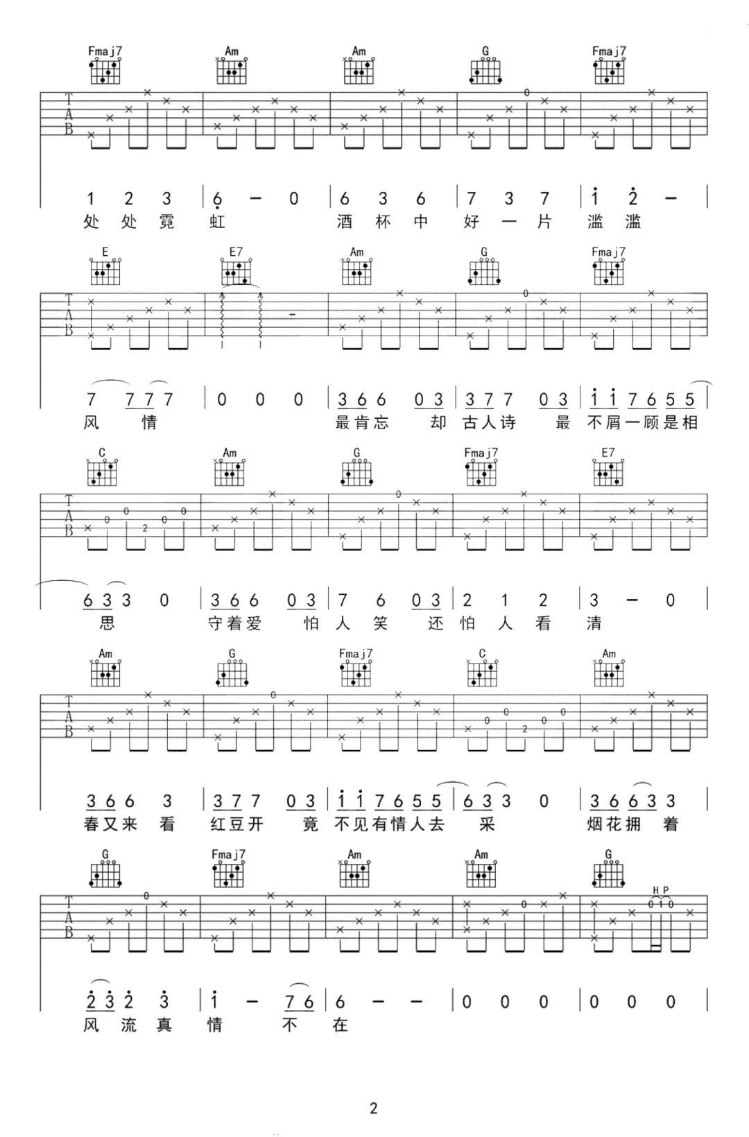 曲谱介绍: 相思吉他谱,原唱者是毛阿敏,用独特的嗓音配合着浓烈的感情,让歌曲宛如一条大河,流不尽的相思情。多年后,晓月老板的再次翻唱,却如涓涓细流,不经意间撩动春心,用不一样的方式诠释着心底相思之情。 相思吉他弹唱谱,选用C调指法,标准调音,可根据自己嗓音来调整变调夹位置,节奏3/4拍,部分小节变换中用到了勾弦和击弦的加花,这些亮点不要忽略,难度:3级较简单。
