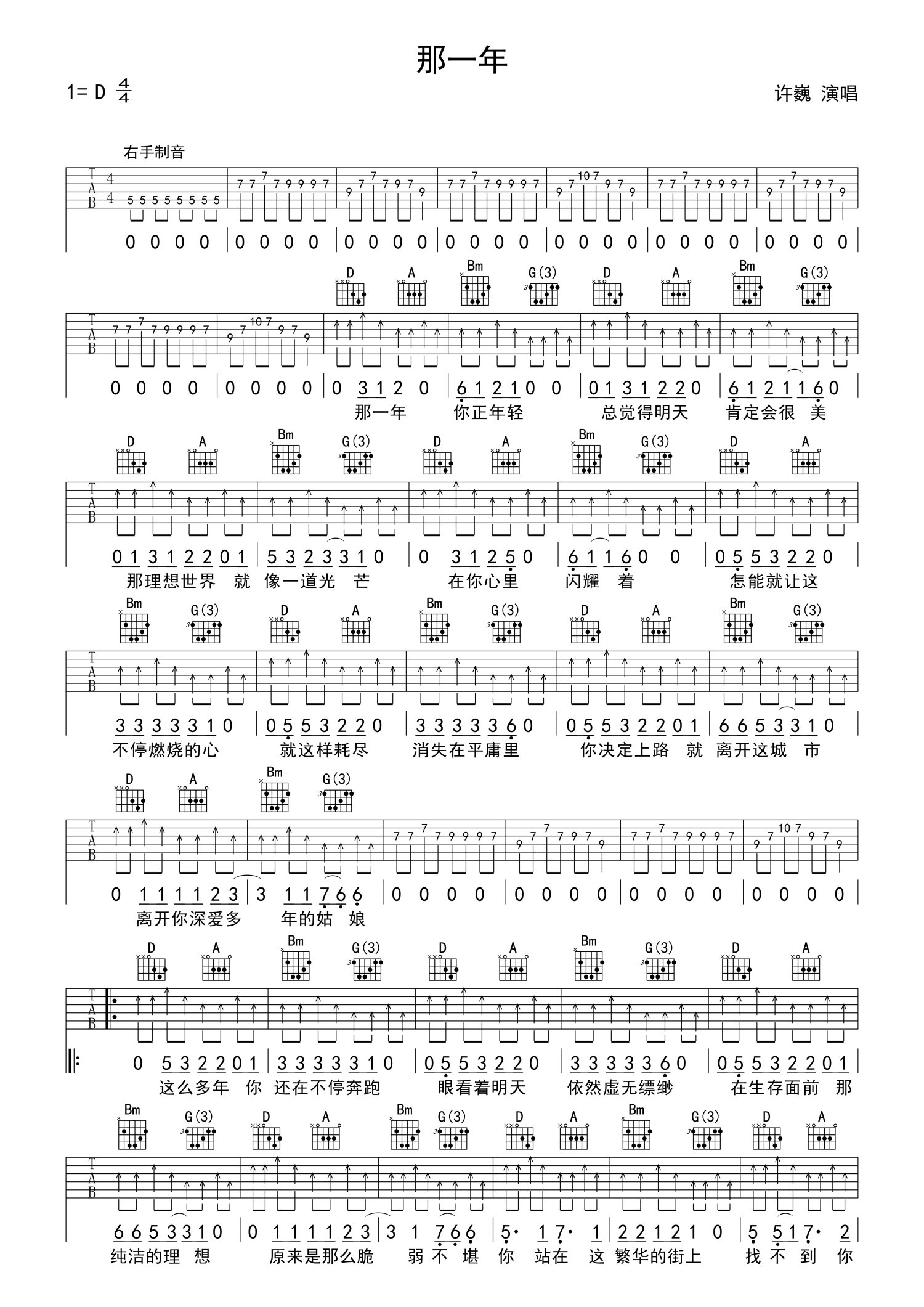 曲谱介绍: 许巍《那一年》吉他谱_D调吉他弹唱谱