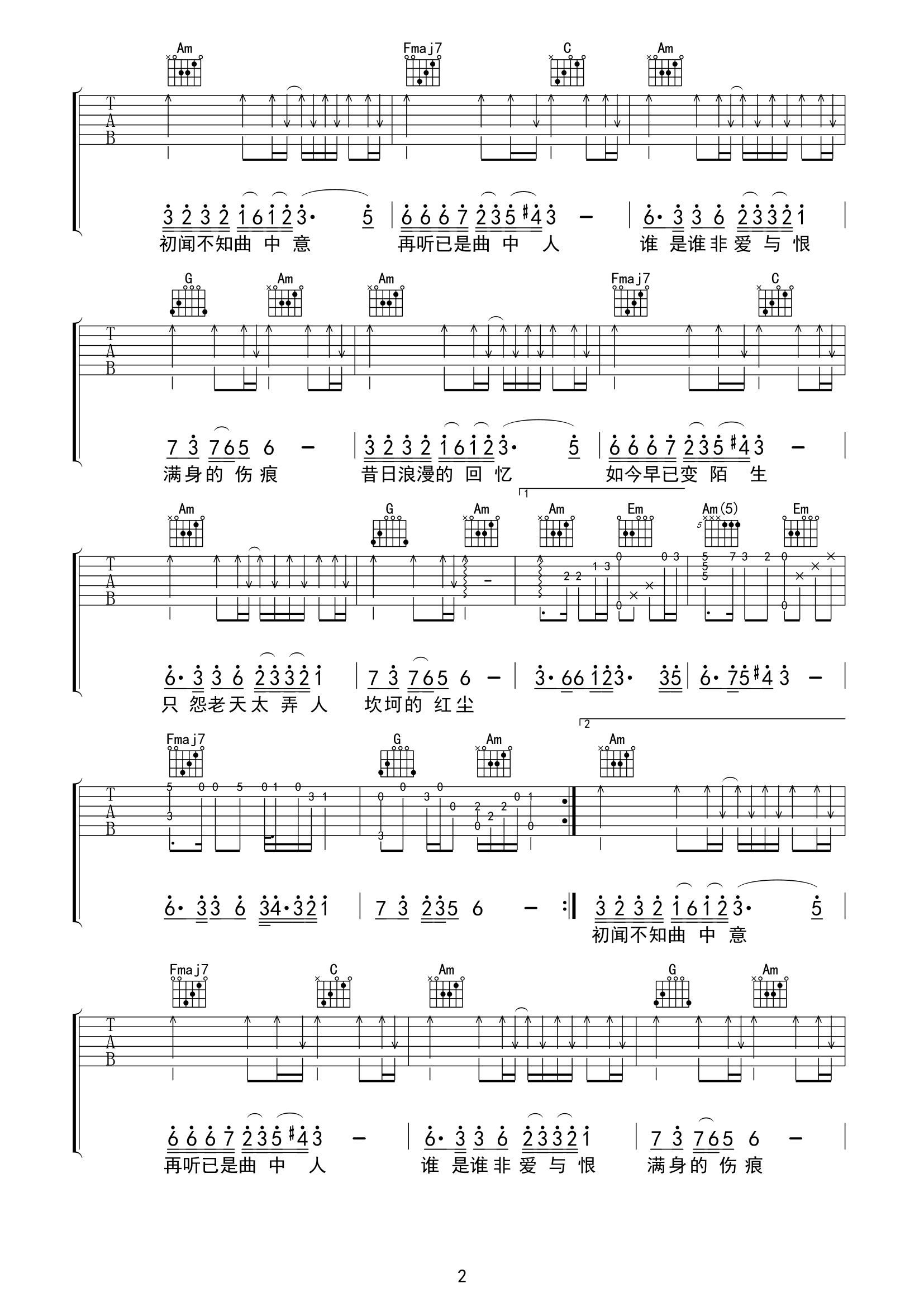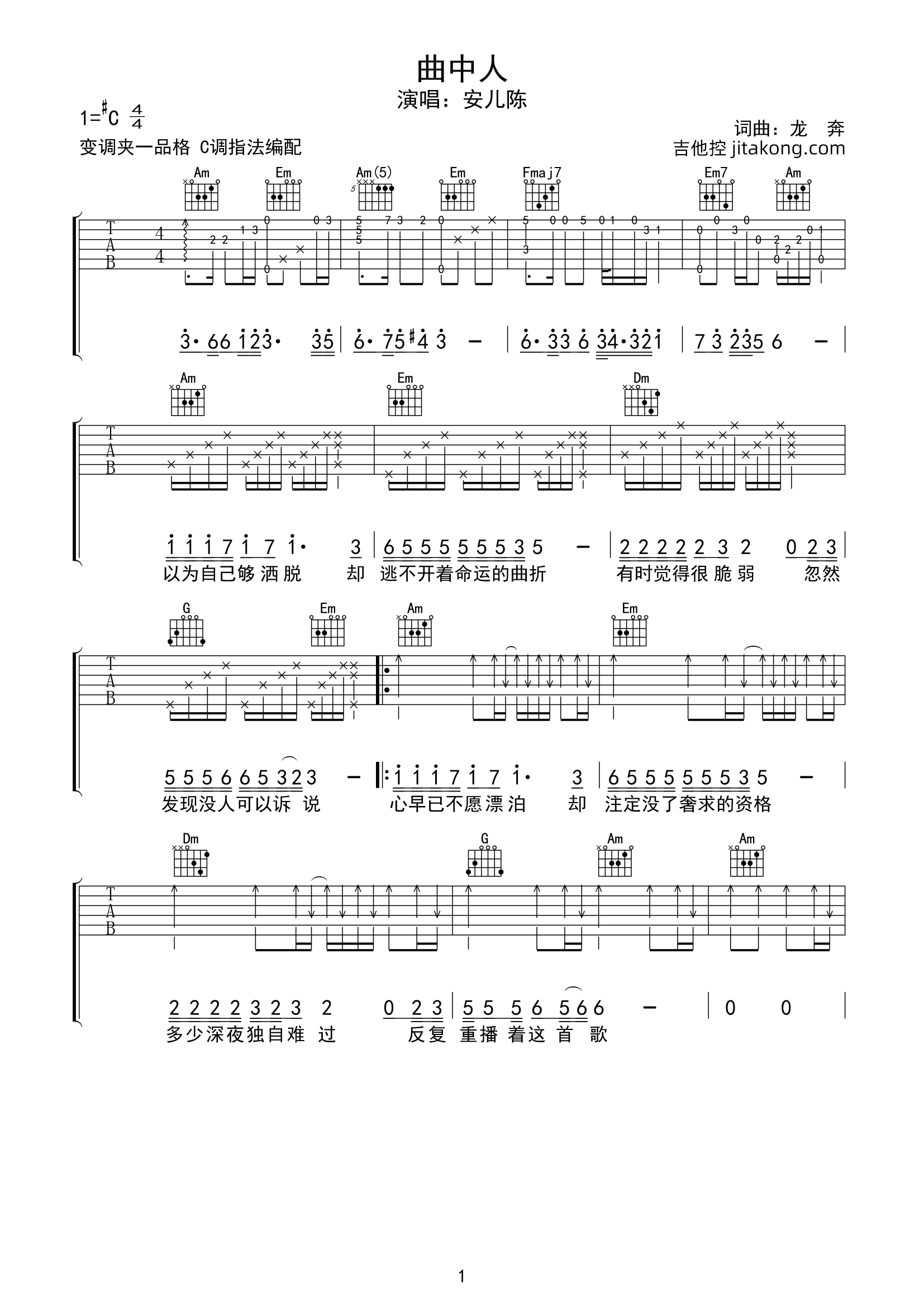 曲谱介绍: 曲中人吉他谱,安儿陈演唱的歌曲,《曲中人》吉他弹唱谱,选用C调指法,原调#C,CAPO夹1品弹唱原调,共2张高清PNG六线谱图例,弹唱难度:4级适中,提示:本谱的附点部分较多,注意节奏的顿挫感。