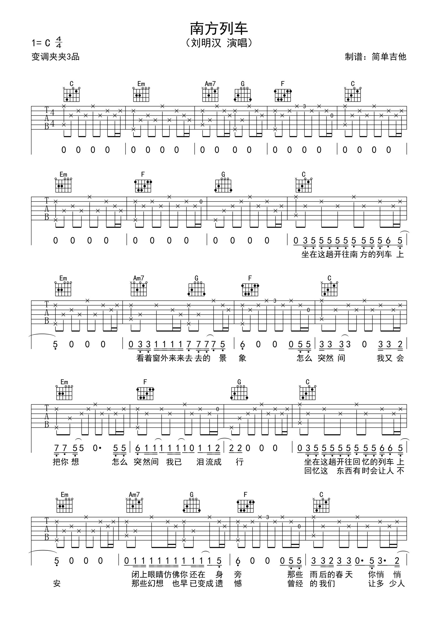 曲谱介绍: 刘明汉《南方列车》吉他谱_C调吉他弹唱谱