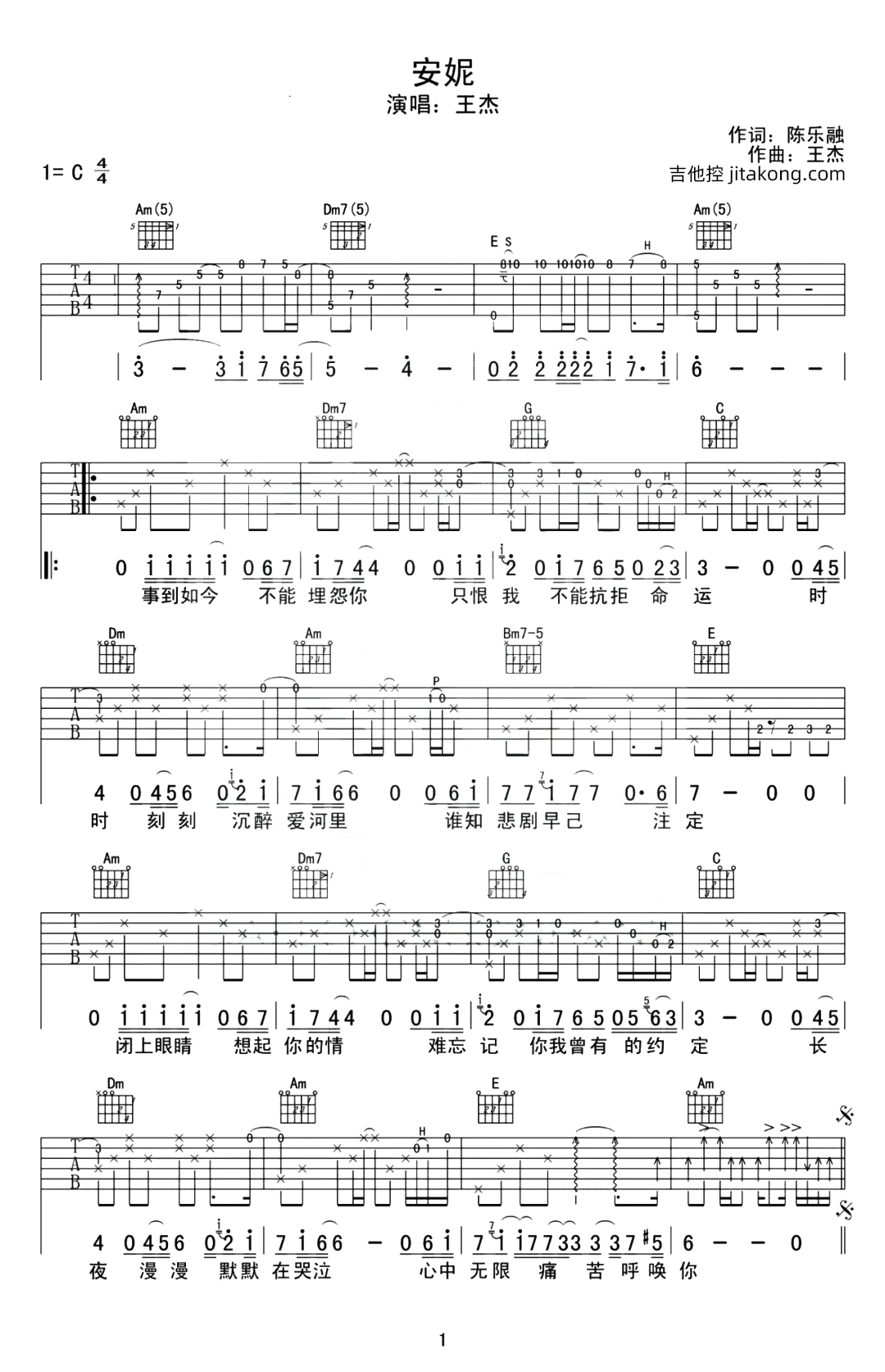 安妮吉他谱 - 王杰 - C调吉他弹唱谱 - 原版