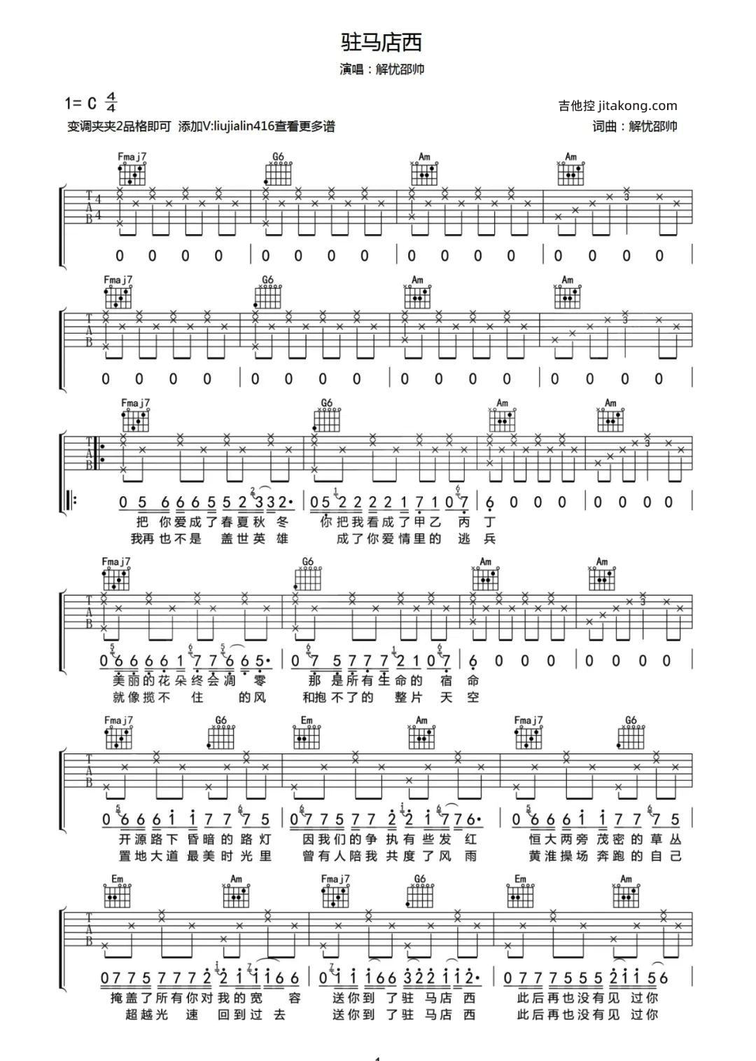 驻马店西吉他谱 - 解忧少帅 - C调吉他弹唱谱