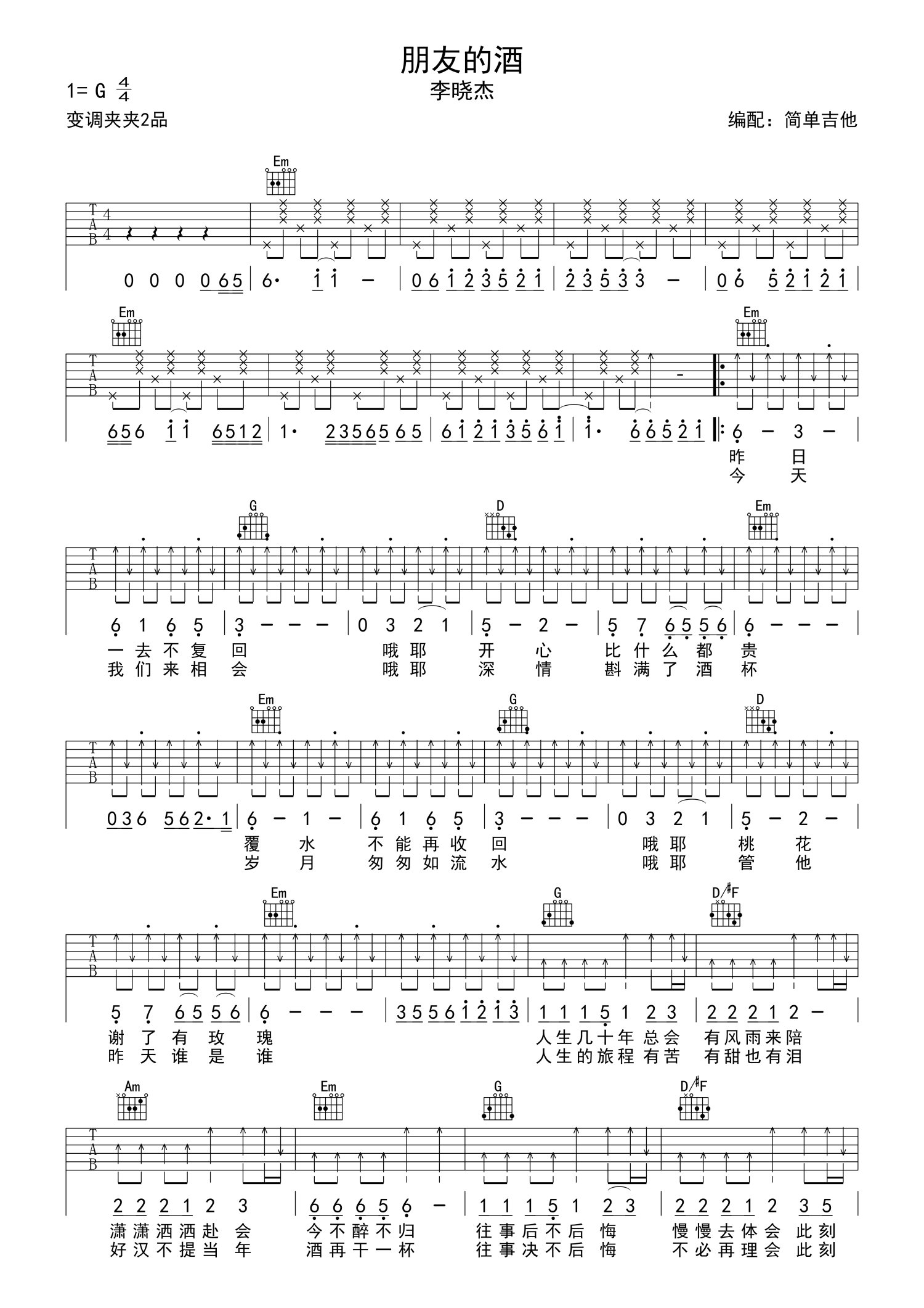 • 朋友的酒吉他谱 - 李晓杰 - G调吉他弹唱谱第1张