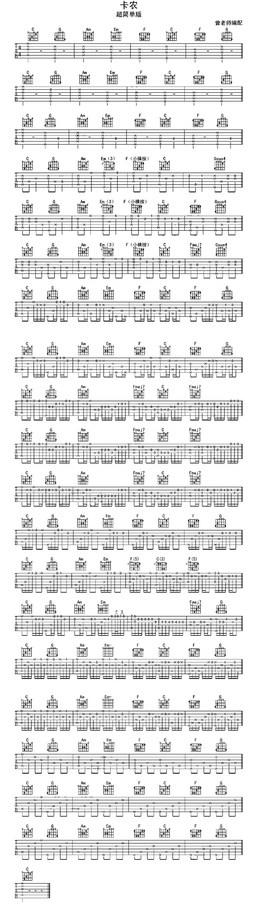 曲谱介绍: 吉他谱介绍:卡农指弹吉他谱,这首曲子采用的是标准调弦,4/4拍的节奏,无需特殊调音。演奏时可不夹变调夹,曲谱由琴谱网更新上传,共1张高清图片指弹吉他谱例,来源于@曾老师编配出品。卡农乐段一直是一首非常经典的曲子,这个版本的谱子虽然说是简单版的,但是对于新手和初学者来说还是有一定难度的,涉及到很多横按和一些和弦外音,需要自己去安排指法,如果没接触过指弹的琴友,可能比较费劲。