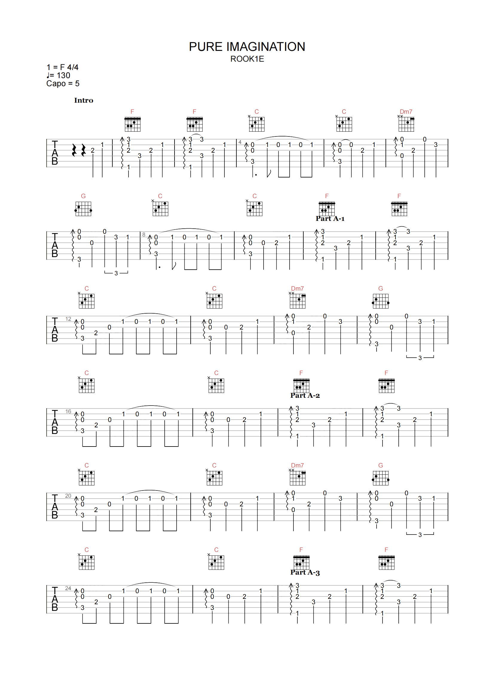 曲谱介绍: PURE IMAGINATION指弹谱,来自ROOK1E的曲子,原本萨克斯的曲目,朦胧感的舒缓调调,听得让人迷醉,可谓是“养肺”佳曲,吉他的指弹也许可以表现出特别的感觉,不妨可以尝试一下哦! 曲谱共有3张高清图片谱例,本谱选用的C调指法,CAPO推荐夹5品来弹奏本曲,速度控制在130拍每分钟,节奏4/4拍。本页下方附PDF版本的下载。 指弹谱详情