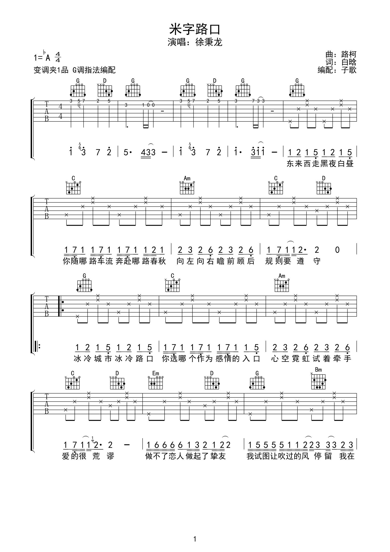 曲谱介绍: 《米字路口》是徐秉龙演唱的歌曲,由白晗作词,路柯作曲,关天天编曲。