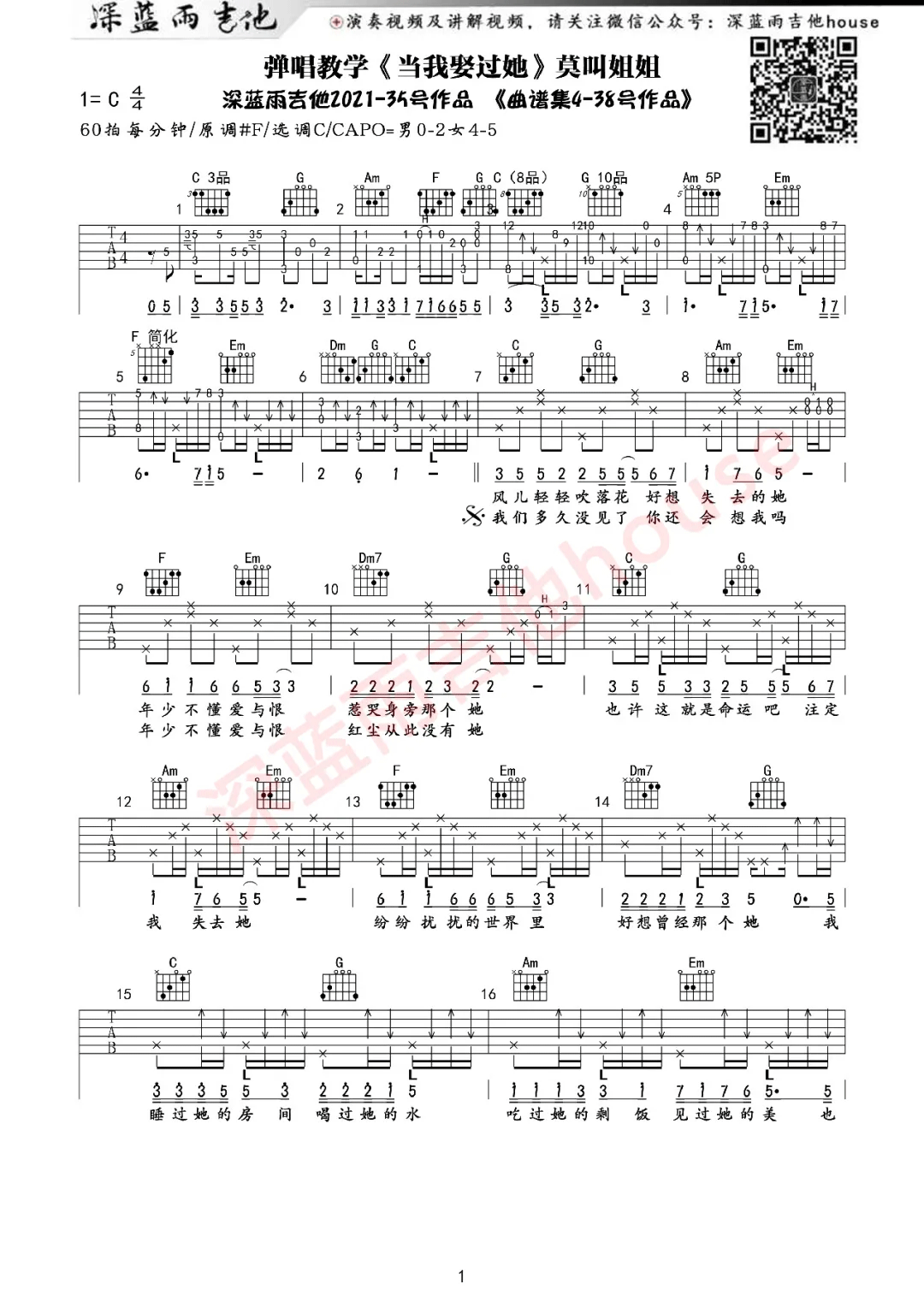 曲谱介绍: 吉他谱介绍:当我娶过她吉他谱,莫叫姐姐演唱的一首歌曲,4/4拍的节奏,这首歌曲的原调为#F调,这里曲谱采用了C调指法进行编配,演唱时夹变调夹6品可回到原调,也可根据个人实际嗓音情况选择。曲谱由琴谱网更新上传,共3张高清图片弹唱吉他谱例,来源于@深蓝雨吉他编配出品。这首好听的网络热门歌曲,原唱为何深彰,莫叫姐姐翻唱,比较适合吉他弹唱的歌曲。深蓝雨老师编配的吉他谱有一定难度,主要在于前奏间奏及尾奏的练习。