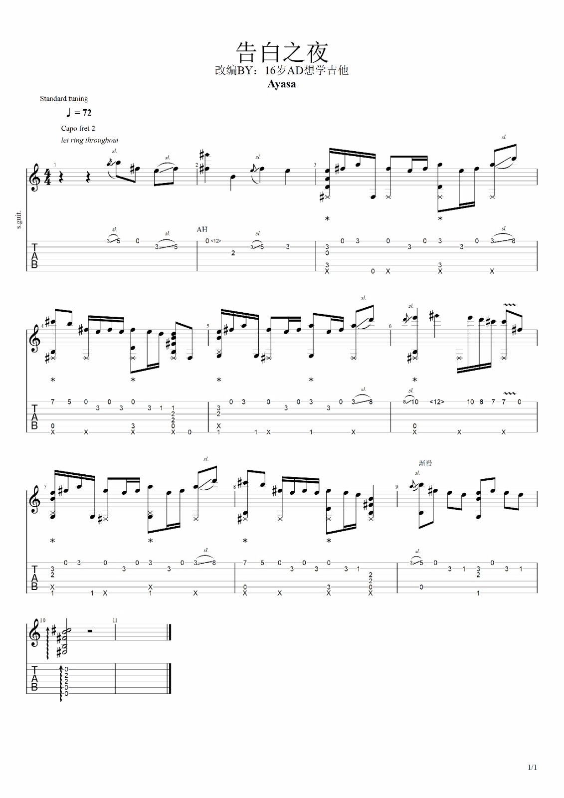 曲谱介绍: 吉他谱介绍:告白之夜指弹吉他谱,Ayasa绚沙的一首指弹吉他曲目,这首曲子采用的是标准调弦,4/4拍的节奏,无需特殊调音。演奏时可不夹变调夹,曲谱由琴谱网更新上传,共1张高清图片指弹吉他谱例,曲谱来源于网络转载,编配制谱者暂不详。这首曲子是日本女小提琴手Ayasa(岛村绚莎)演奏的一首小提琴曲,非常好听,后来网上有琴友将其改编为指弹曲,一时之间受到很多人的好评。