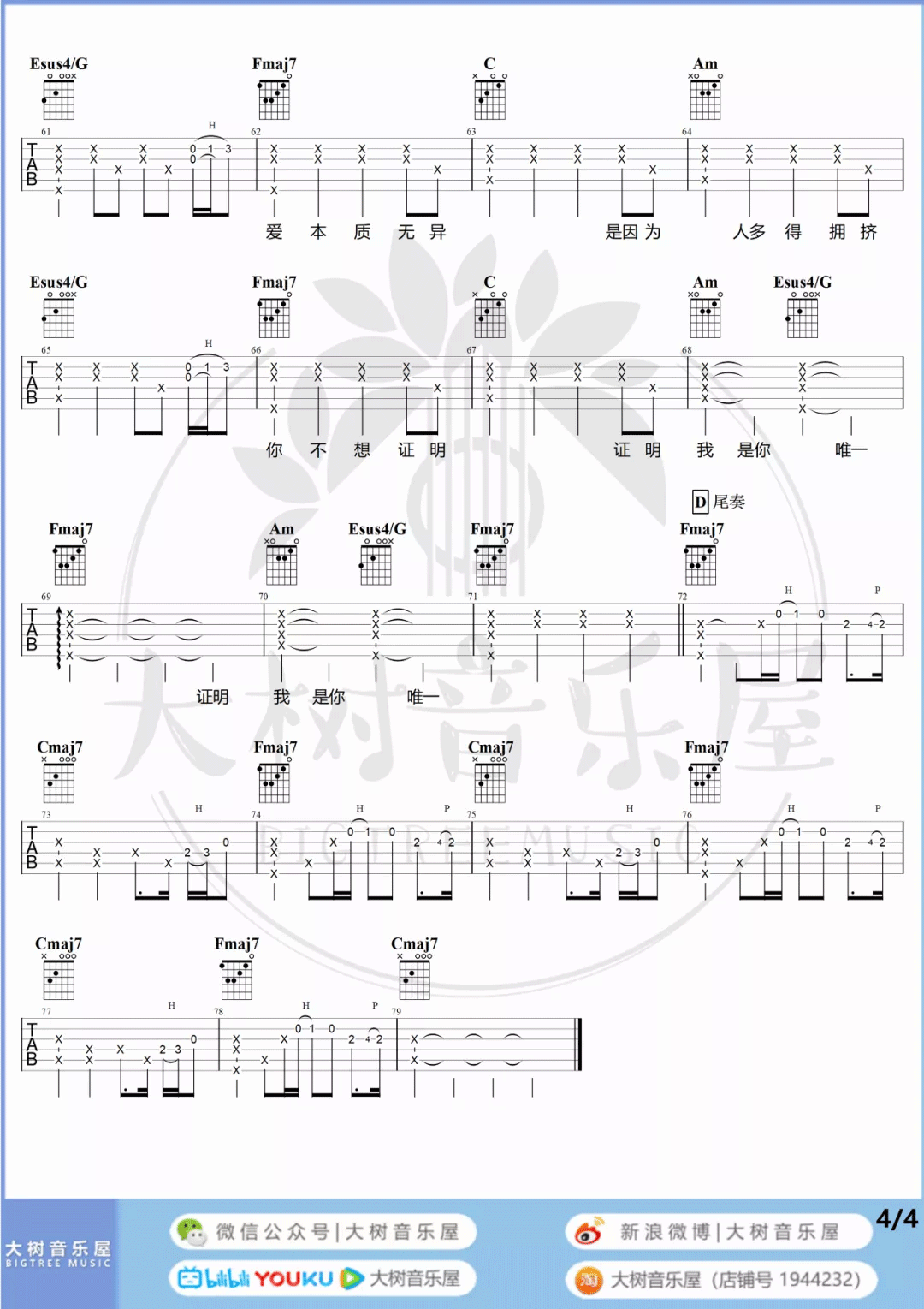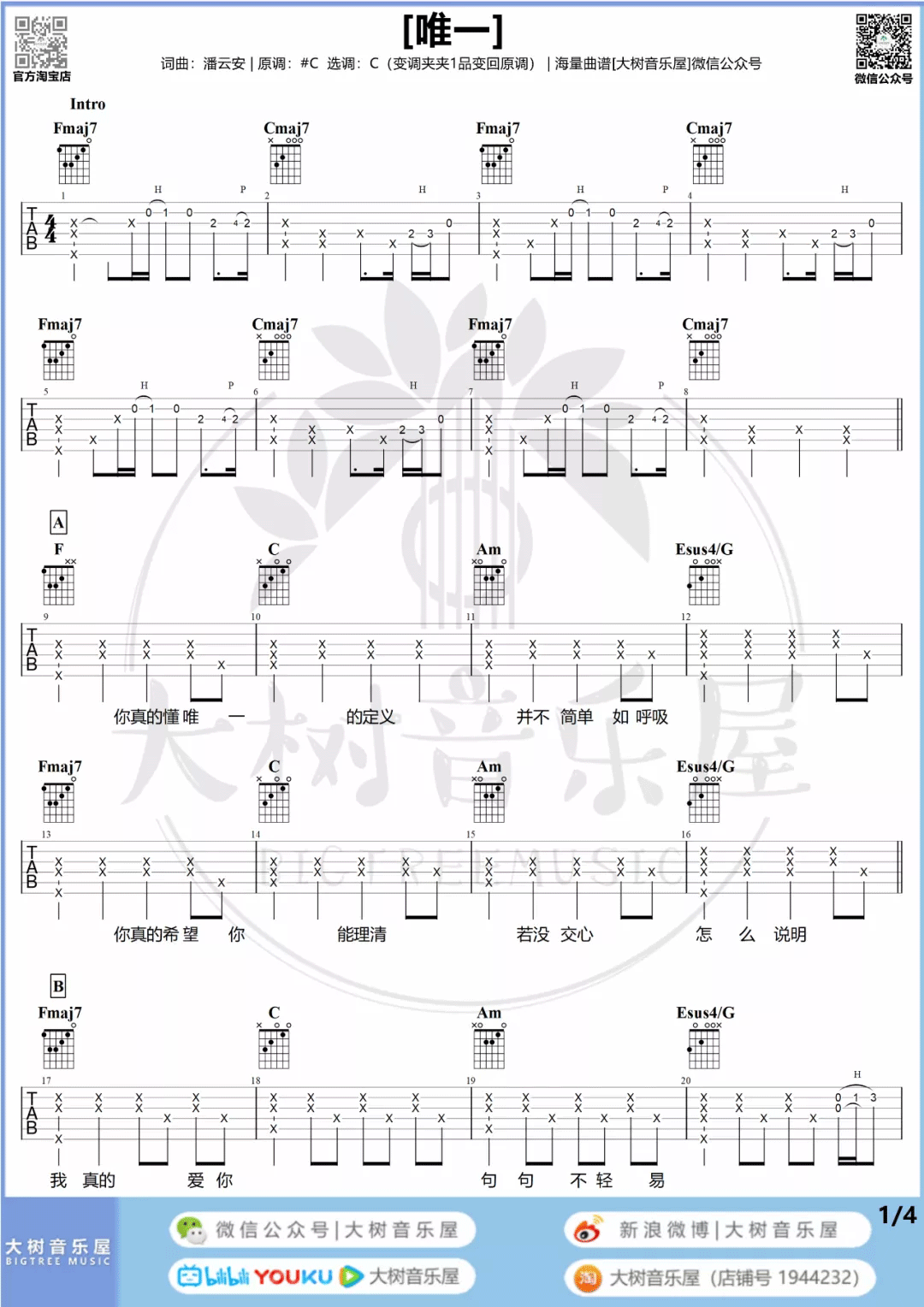 曲谱介绍: 吉他谱介绍:唯一吉他谱,告五人演唱的一首歌曲,4/4拍的节奏,这首歌曲的原调为#C调,这里曲谱采用了C调指法进行编配,演唱时夹变调夹1品可回到原调,也可根据个人实际嗓音情况选择。曲谱由琴谱网更新上传,共4张高清图片弹唱吉他谱例,来源于@大树音乐屋编配出品。告五人是台湾的一支宝藏乐队,他们的歌总是给人一种特别的感觉。这个版本的吉他谱还原度还比较高,难度不算太大,练习要点主要在于前奏及尾奏的掌握,其他部分不难。 唯一吉他弹唱教学