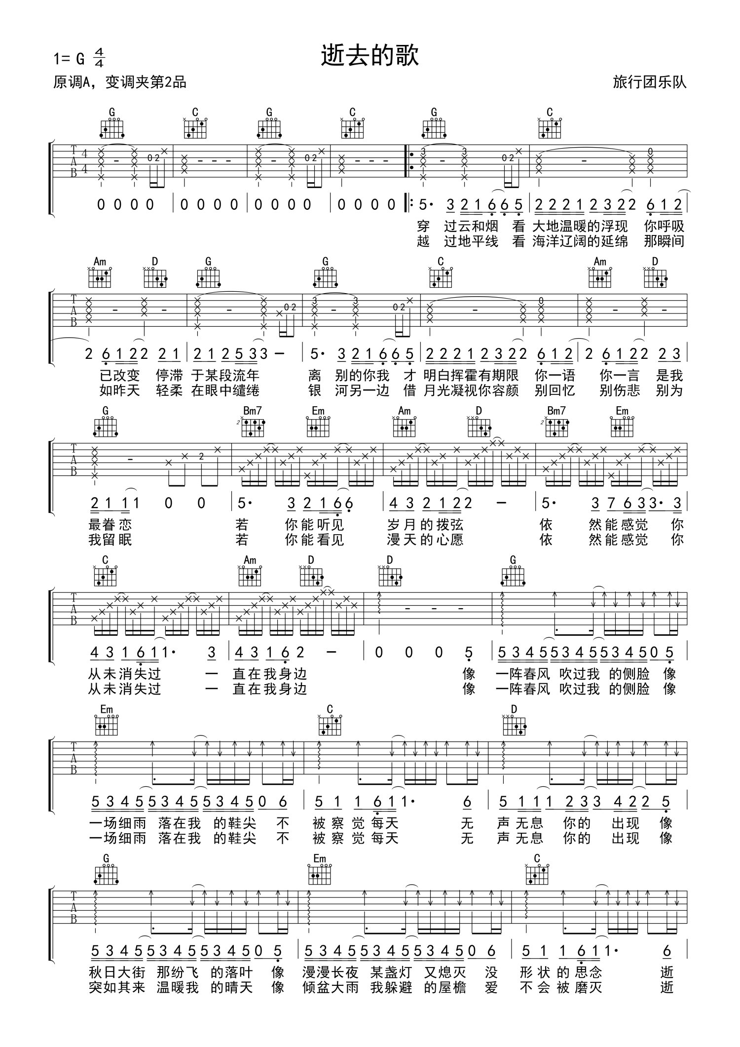 曲谱介绍: 旅行团乐队《逝去的歌》吉他谱_G调吉他弹唱谱
