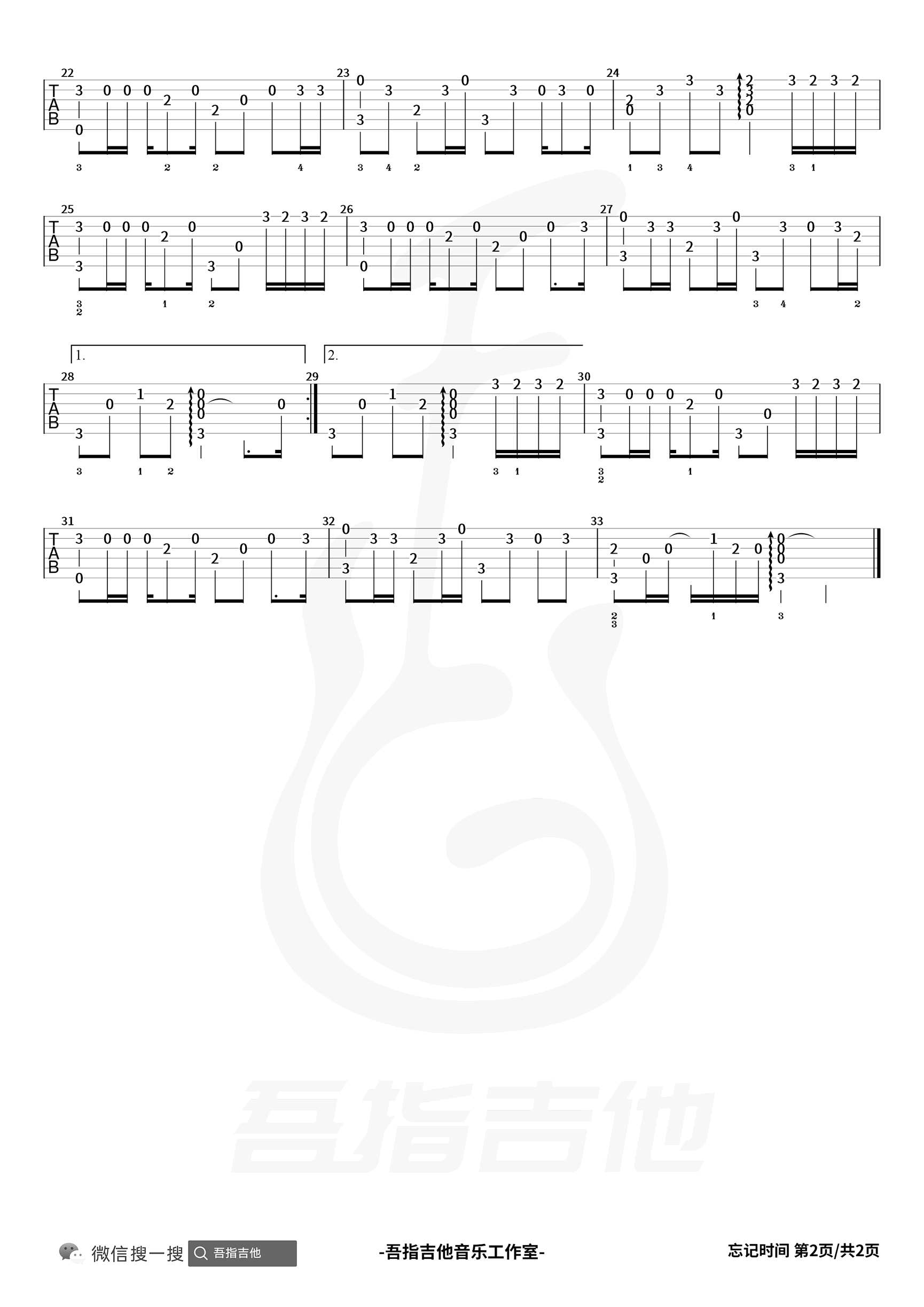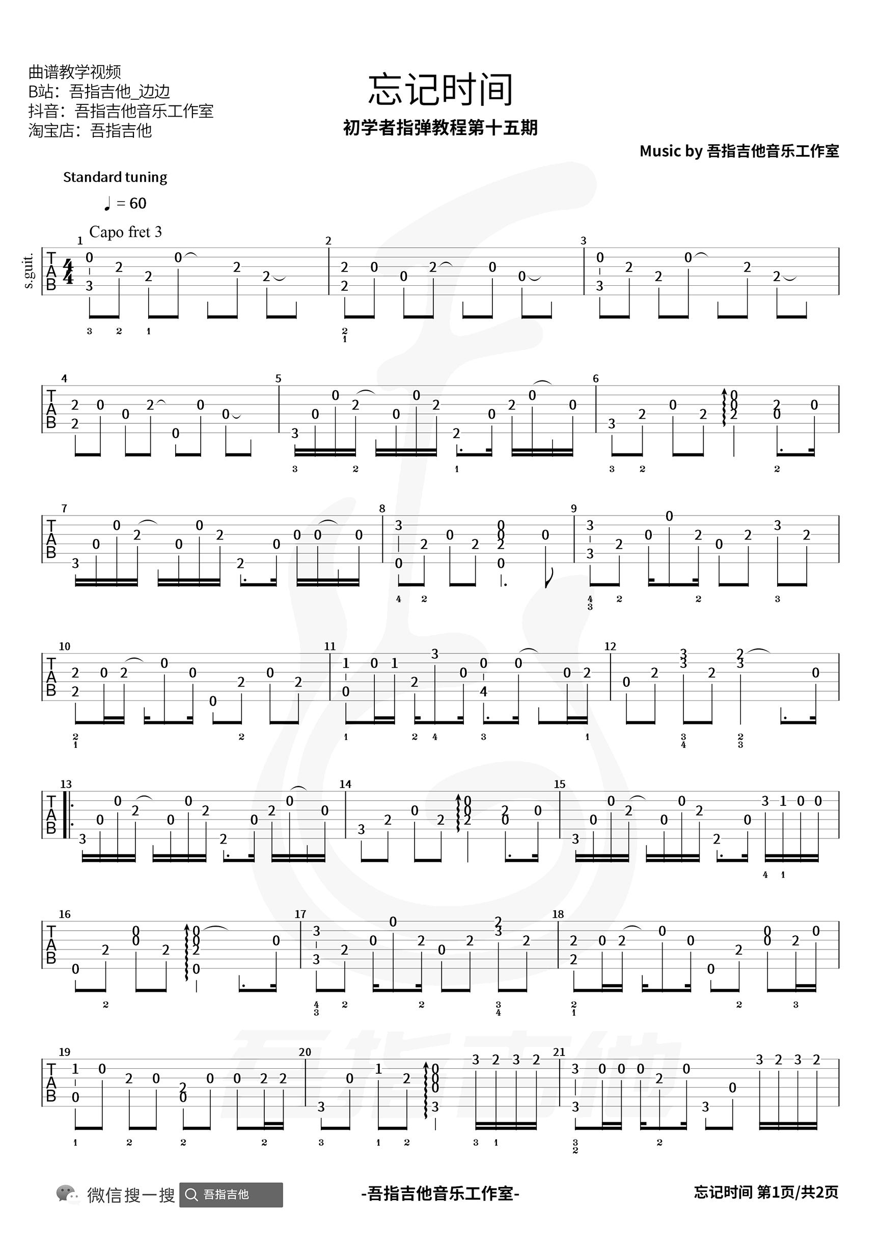 曲谱介绍: 吉他谱介绍:忘记时间指弹吉他谱,胡歌的一首指弹吉他曲目,这首曲子采用的是标准调弦,4/4拍的节奏,无需特殊调音。演奏时可不夹变调夹,曲谱由琴谱网更新上传,共2张高清图片指弹吉他谱例,来源于@吾指吉他编配出品。歌曲琅琅上口,引人遐想,胡歌的演唱发挥了自己的声音特点,歌曲可听性和可传唱度较高。 忘记时间指弹吉他教学