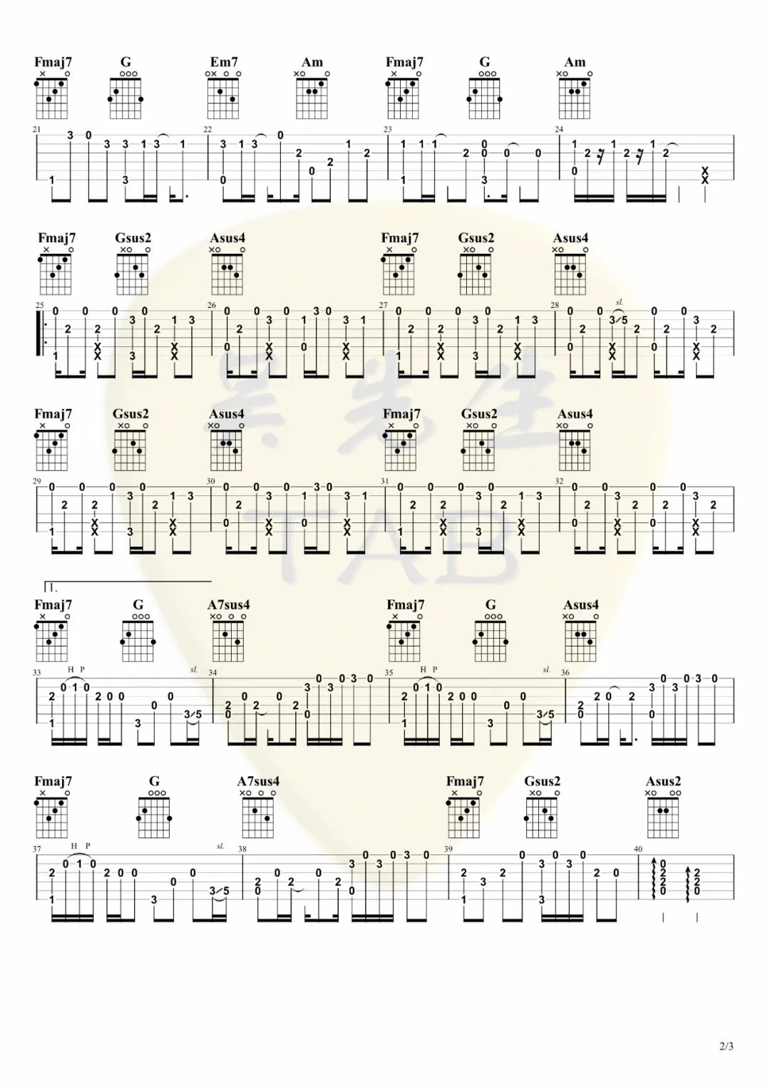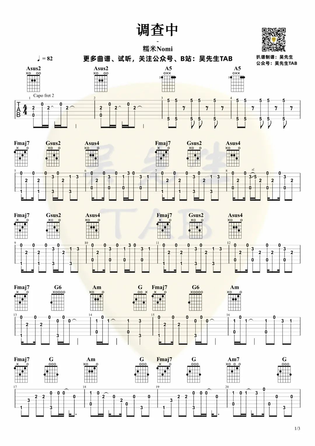 曲谱介绍: 吉他谱介绍:调查中指弹吉他谱,糯米Nomi的一首指弹吉他曲目,这首曲子采用的是标准调弦,4/4拍的节奏,无需特殊调音。演奏时可不夹变调夹,曲谱由琴谱网更新上传,共3张高清图片指弹吉他谱例,来源于@吴先生TAB编配出品。